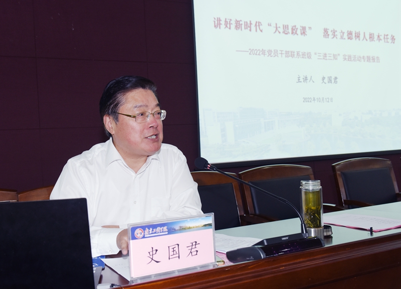 面对新形势,史国君书记指出,要促进领导力量、管理力量、思政教育力量在育人理念、育人方向、育人目标等方面趋向一致,推动“三全育人”到岗、到位、到家,努力实现学生思想政治素养和个人素质能力提升。针对下一阶段工作,史书记提出具体要求:要久久为功,持续构建“三全育人”格局;要守正创新,不断深化“大思政课”内涵建设;要与时俱进,落实立德树人根本任务。他号召全体党员干部在持续推进“三进三知”专题实践活动中勤思善用“大思政课”,合力培养时代新人,以实际行动迎接党的二十大胜利召开。