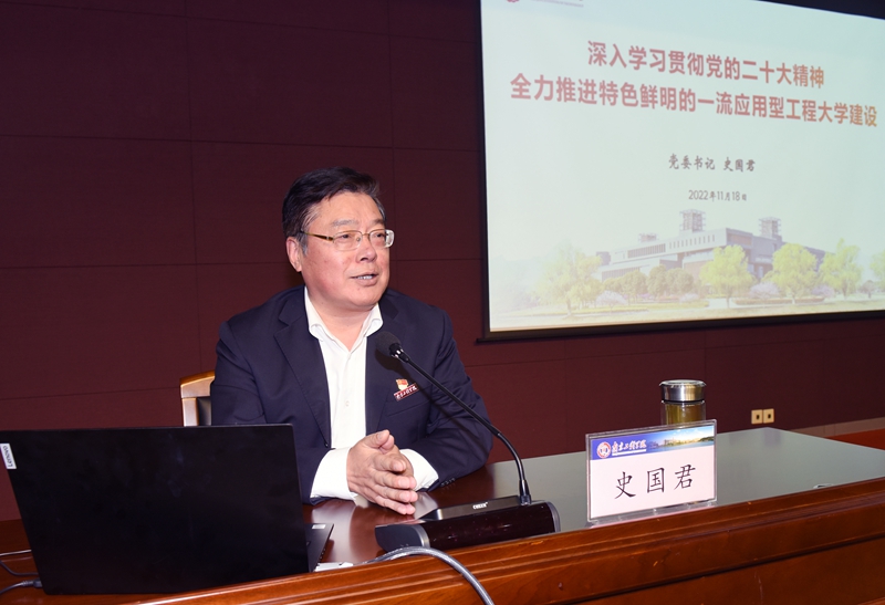 为深入贯彻落实党的二十大精神,切实让党的最新理论创新成果进课堂、进师生头脑,11月18日下午,党委书记史国君以“深入学习贯彻党的二十大精神 全力推进特色鲜明的一流应用型工程大学建设”为主题,在至勤楼·行政中心多功能厅为大学生讲授思政公开课,并作党的二十大精神宣讲。