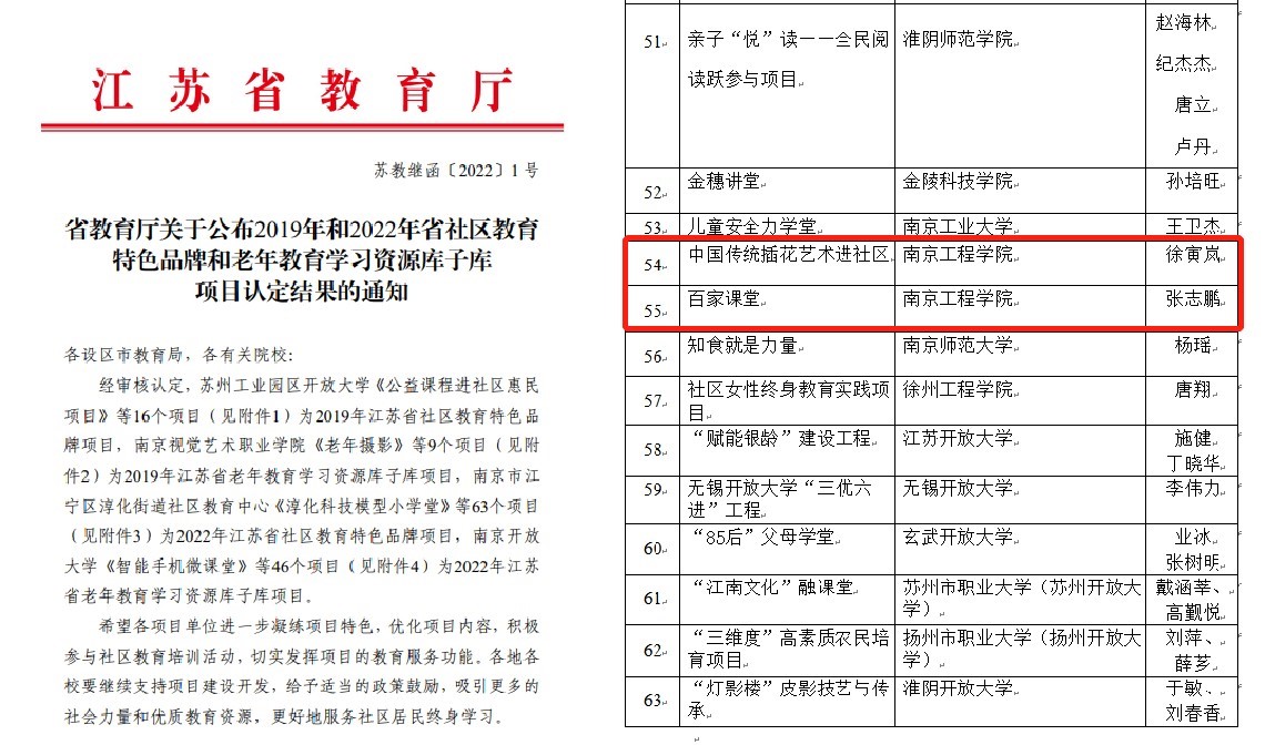 近日,江苏省教育厅发布《2019年和2022年省社区教育特色品牌和老年教育学习资源库子库项目认定结果的通知》(苏教继函〔2022〕1号),beat365《中国传统插花艺术进社区》和《百家课堂》两个项目经组织申报、评审、公示等环节,成功入选2022年江苏省社区教育特色品牌项目。