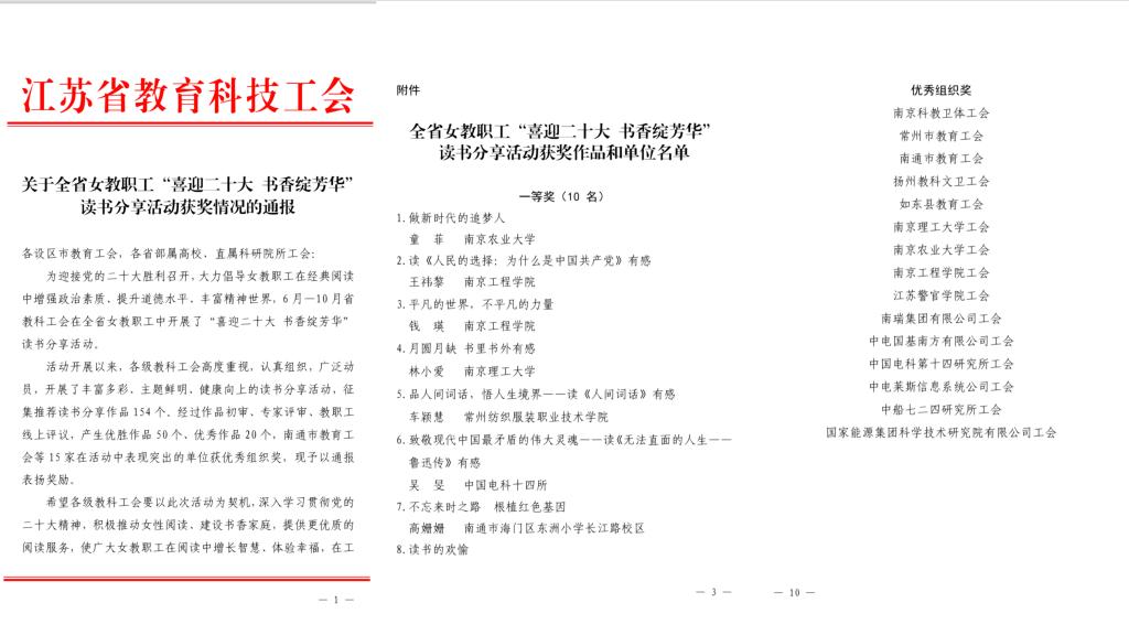 近日,江苏省教育科技工会发布《关于全省女教职工“喜迎二十大 书香绽芳华”读书分享活动获奖情况的通报》,beat365选送的自动化学院王祎黎老师《读<人民的选择:为什么是中国共产党>有感》和计算机工程学院钱瑛老师《书香绽芳华,在平凡中汲取力量》两部作品在全省154篇读书分享作品中脱颖而出,均获得一等奖的好成绩。beat365荣获优秀组织奖。