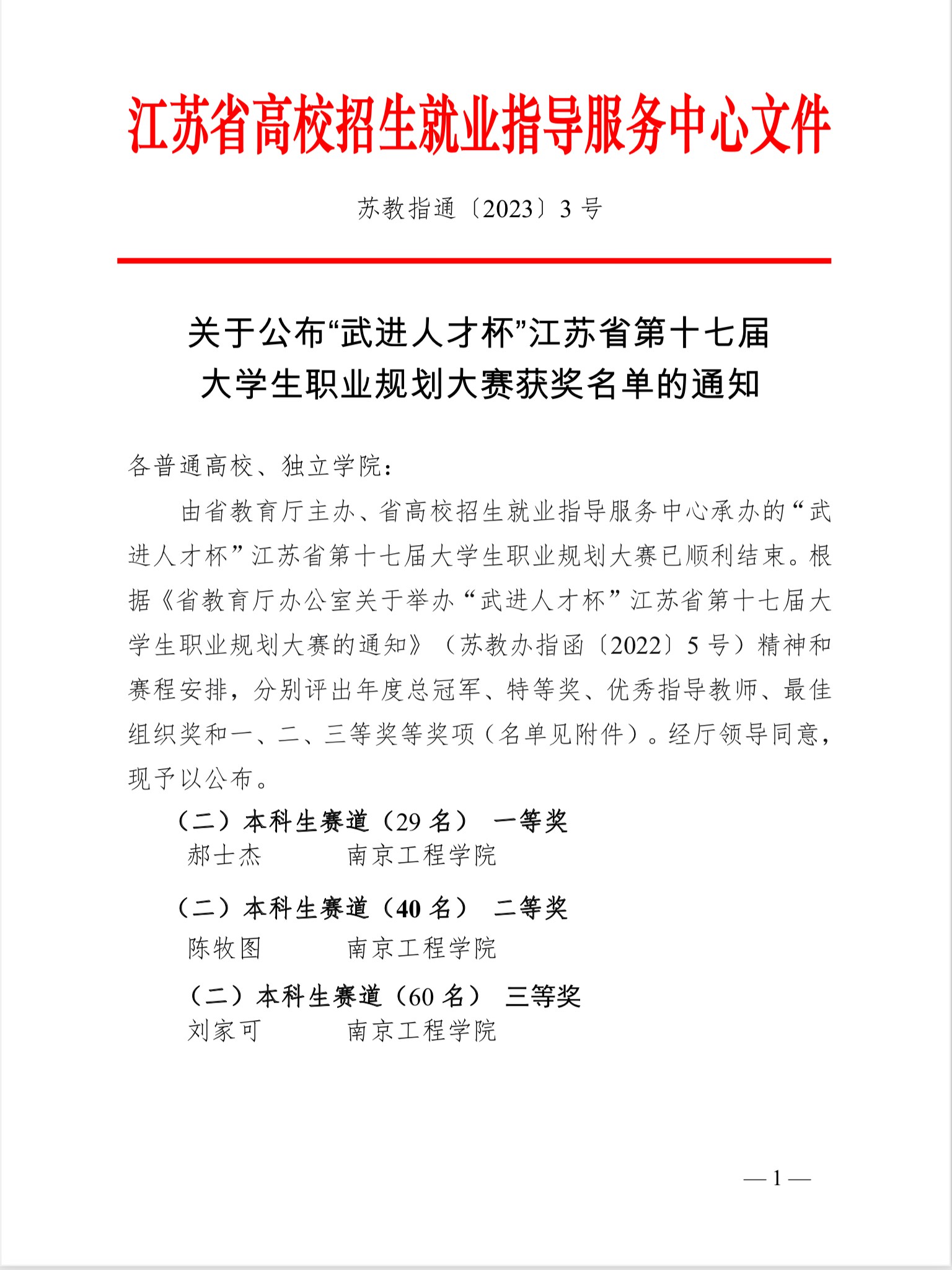 近日,“武进人才杯”江苏省第十七届大学生职业规划大赛总决赛获奖结果公布,beat365推荐参加省赛的三名选手全部榜上有名,材料科学与工程学院郝士杰,信息与通信工程学院陈牧图、计算机工程学院刘家可三位同学分别荣获本科生赛道一、二、三等奖。