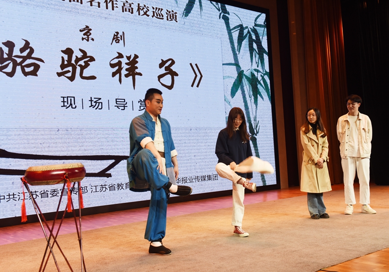 现代京剧《骆驼祥子》作为江苏省演艺集团京剧代表性剧目之一,根据老舍先生《骆驼祥子》改编,讲述了20世纪20年代北京发生的故事。它以人力车夫“祥子”为中心,以其在买车问题上的“奋斗、挣扎、幻灭”三起三落为主线,展现一名“草根”对生活的不懈追求和二十世纪二十年代初北平社会各阶层的生活画面。浓厚的京腔京韵,地道的风土人情,深切的人文关怀,生动地展示着这部京剧的独特魅力。剧目导赏环节中,黄金朝等主要演员与现场师生分享了饰演剧中角色的心得体会,几位学生观众积极互动,走上舞台,有模有样地学习了剧中动作,现场气氛欢乐。