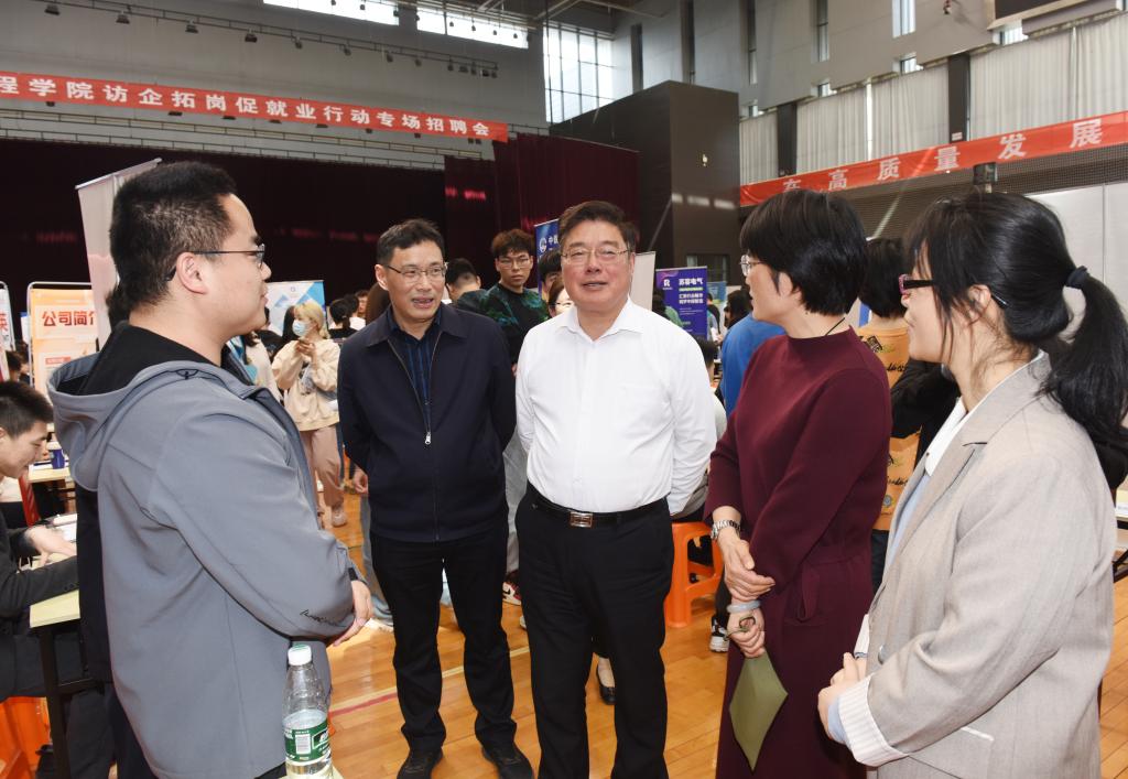 为深入贯彻党的二十大关于“实施就业优先战略”的决策部署,落实教育部进一步深入开展访企拓岗促就业行动要求,4月12日下午,beat365在天健苑·体育中心举办“访企拓岗促就业行动”专场招聘会,校党委书记史国君、党委常委、副院长张仰飞来到活动现场与用人单位、求职毕业生进行深入交流。学生工作处负责同志、二级学院(中心)党政负责人、分管学生工作负责人、专业教师代表参加活动。