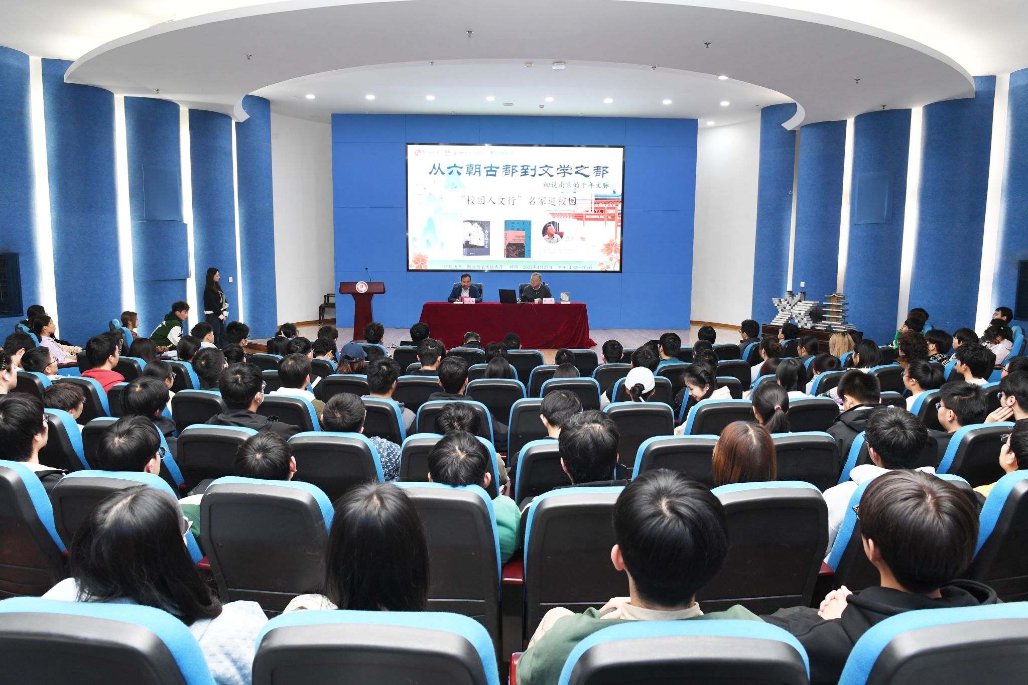 有着“薛金陵”之称的薛冰先生著有长篇小说《城》《盛世华年》,文化随笔集《家住六朝烟水间》《漂泊在故乡》《书生行止》《拈花意》及专著《南京城市史》《格致南京》《秦淮河》等六十余部作品,是南京文脉的优秀传承者、中国文学的积极发扬者。讲座现场,薛冰从三千多年前的江宁湖熟文化谈起,讲述了东吴、东晋到南朝的文学创作、文学理论、文学作品以及文学教育,从历史的深处观照六朝南京在“立文学规范”方面的深远影响;从李白的《登金陵凤凰台》到李商隐的《南朝》,从南唐二主词到宋元词曲……薛冰通过列举大量作品,让师生们体会到山明水秀的金陵一直吸引着大量文学巨匠来这里寻文学正统,可谓“文脉绵延,成果辉煌”;“六朝古都、十代都会、博爱之都……”历史名城南京拥有众多名号,在薛冰先生看来,“世界文学之都”是南京最为响亮的头衔,无论是历史文化、当代出版,还是文学交流、文学出版,南京都无愧于“世界文学之都”称号。秦淮河、紫金山、大报恩寺、海丝遗迹,鲁迅、胡小石、余光中、赛珍珠,《桃花扇》《儒林外史》《红楼梦》《闲情偶记》……南京的山川名胜、人物风流、优秀作品在讲座中化作优美史话,深深地吸引着在场师生。