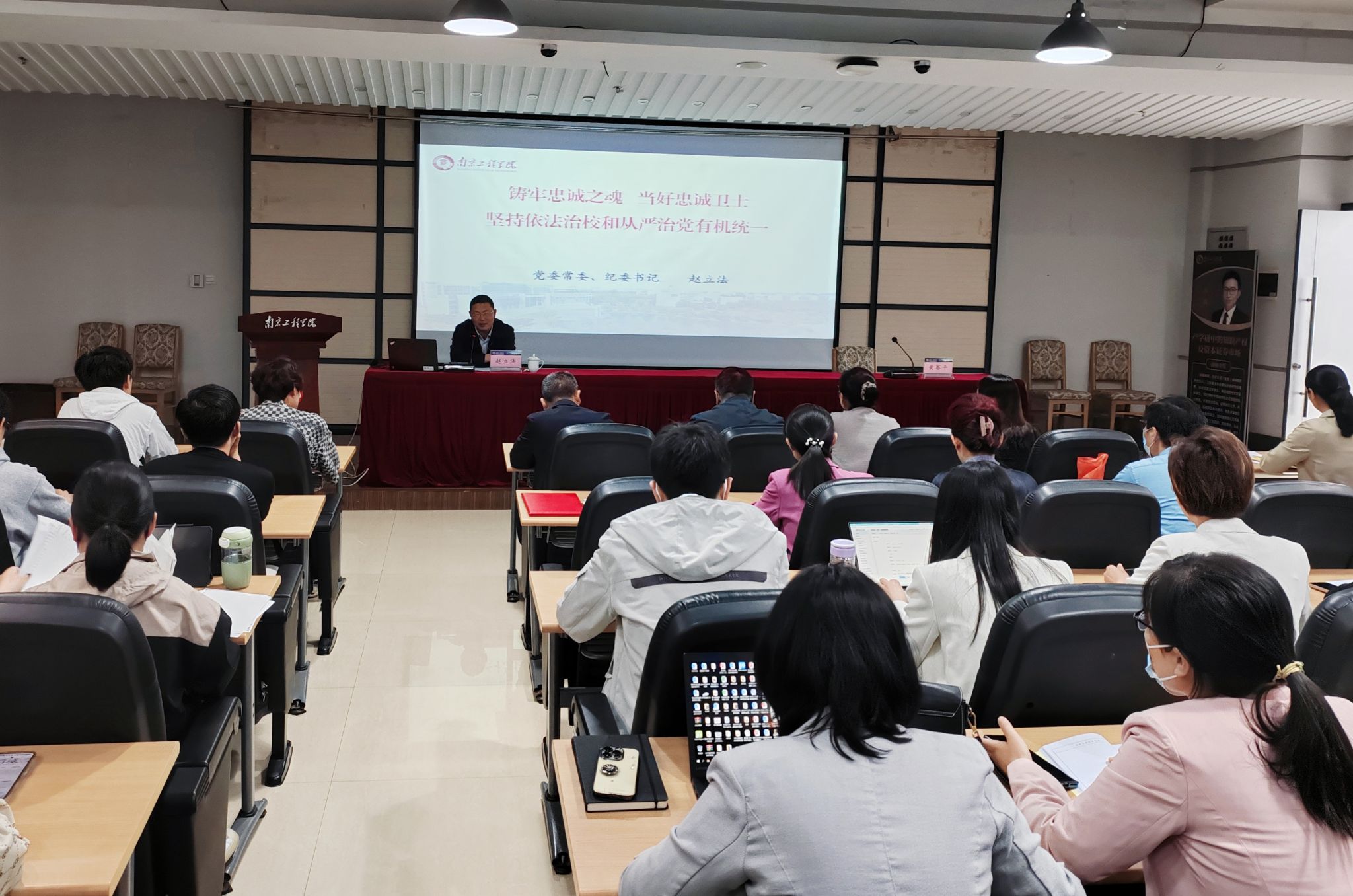 赵立法书记结合自身开展学习贯彻习近平新时代中国特色社会主义思想主题教育和纪检监察干部队伍教育整顿的体会收获,在党课中系统回顾了中国特色社会主义法治道路的实践历程、习近平法治思想的核心要义以及江苏在推进法治江苏建设方面的探索发展成效等,并结合学校实际,就新形势下推进学校依法治理和全面从严治党有机统一等谈了意见和建议。