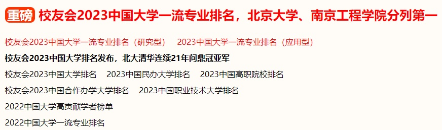 校友会2023中国大学一流专业排名坚持实施分类分级分档评价,依据高校办学定位、学科专业建设水平和本科专业发展定位,按“研究型”与“应用型”两个类型进行评价。2023年专业排名评价指标由学科水平、培养质量、师资水平、专业水平与专业影响等5大指标构成,在2022年中国高校本科专业星级评价基础上,依据高校专业排名位次、位次百分比和星级排名,将中国高校本科专业分为A++、A+、A、B++、B+、B、C和D等8个档次。