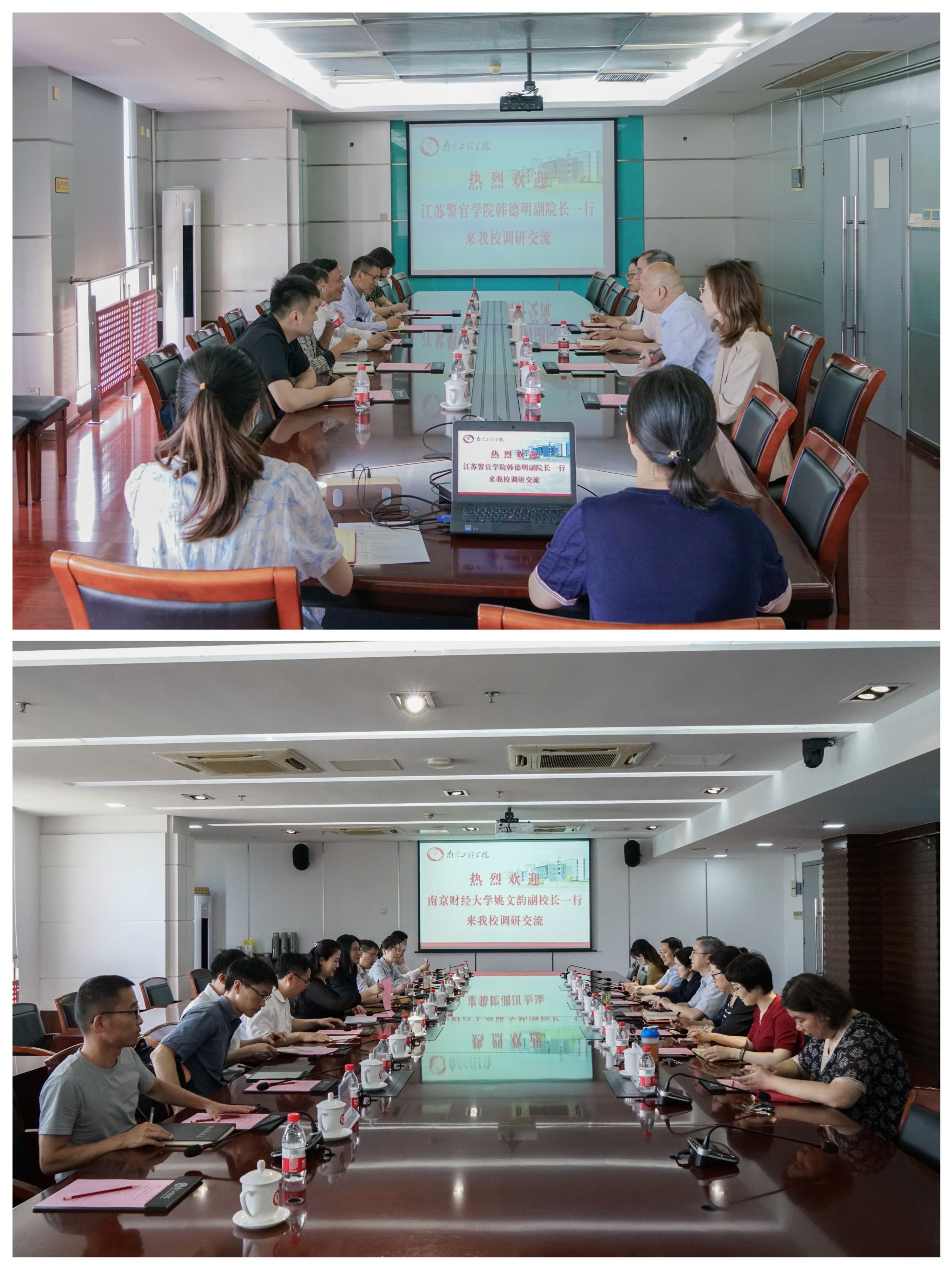 5月15日、19日,江苏警官学院副校长韩德明、南京财经大学副校长姚文韵先后带队来访beat365,beat365党委常委、副院长郑锋热情接待了来宾并座谈,相关职能部门负责人参加。