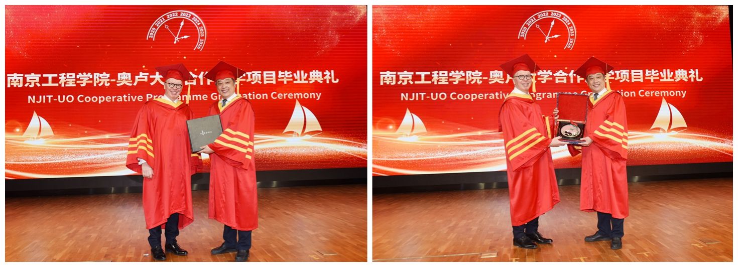 在学位授予仪式上,史金飞院长为毕业生逐一拨穗正冠、授予毕业证书和学位证书;奥卢大学副校长Tapio Koivu为毕业生颁发奥卢大学成绩单;奥卢大学教师代表Jouni Markkula教授、Virpi Viio赠送毕业礼物。中芬两校还互赠礼物作为留念。