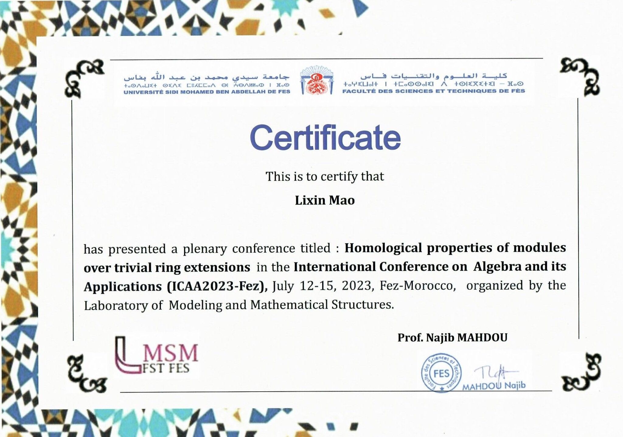 国际代数学及应用学术会议(ICAA)于7月12日至15日在摩洛哥西迪·穆罕默德·本·阿卜杜拉大学召开。应会议组委会主席、西迪·穆罕默德·本·阿卜杜拉大学数学系Najib Mahdou教授邀请,beat365数理学院毛立新教授参加了本次会议,并作题为《Homological properties of modules over trivial ring extensions》大会特邀报告。