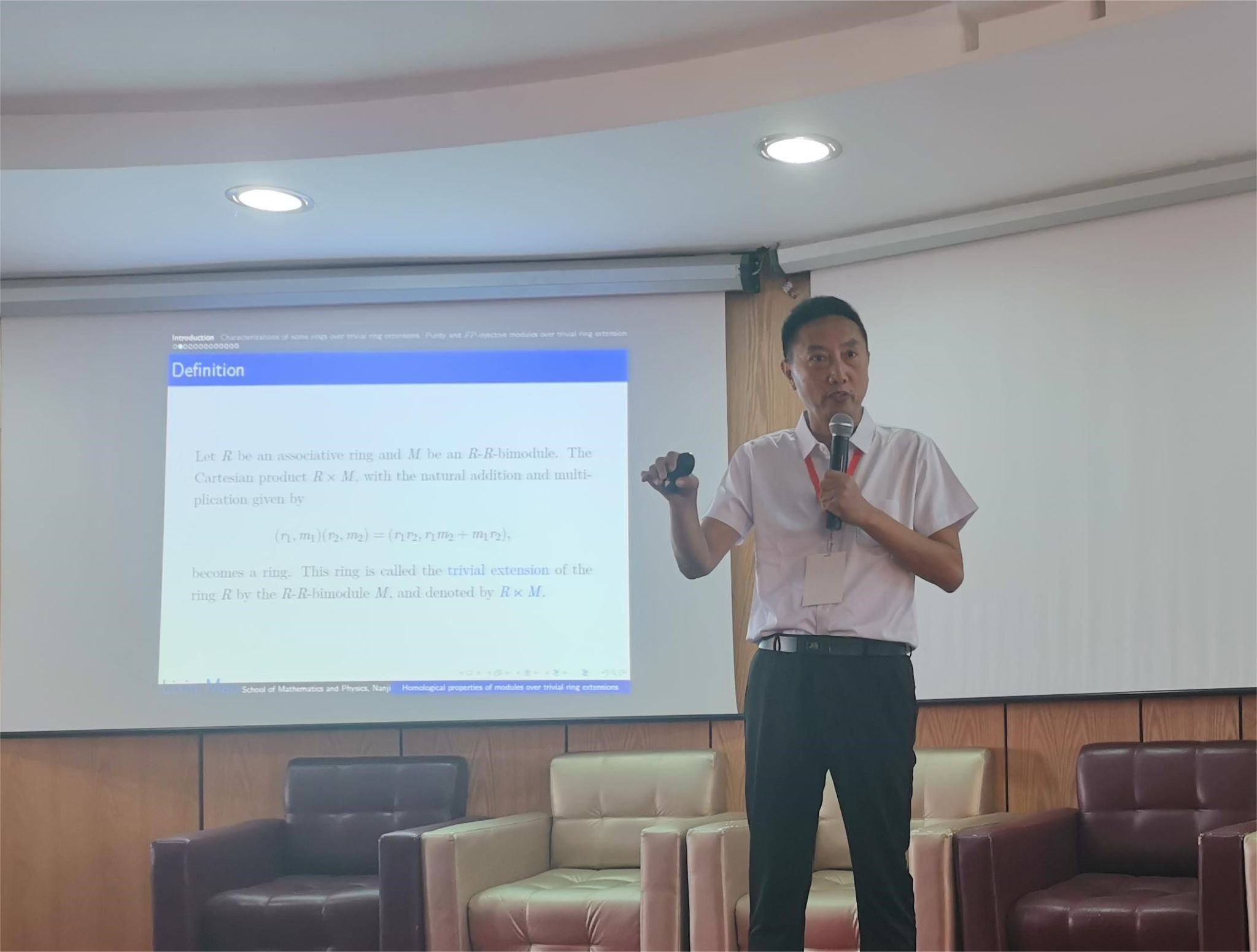 毛立新教授分享了最近在环论和同调代数领域取得的系列研究成果。他在报告中系统回顾了环的平凡扩张的概念以及在环论发展史上所起的重要作用,给出了若干重要环类的平凡扩张的刻画以及平凡扩张环上的纯投射模、纯内射模和FP-内射模的具体描述,阐述了如何构造平凡扩张环上的Gorenstein投射模、Gorenstein内射模以及Gorenstein平坦模,并例举了这些成果在Morita系统环上的应用。毛教授的学术报告丰富了环扩张在范畴意义上的性质,统一了前人的一些已有成果,拓展了环的平凡扩张的应用范围,引起了与会者的浓厚兴趣。