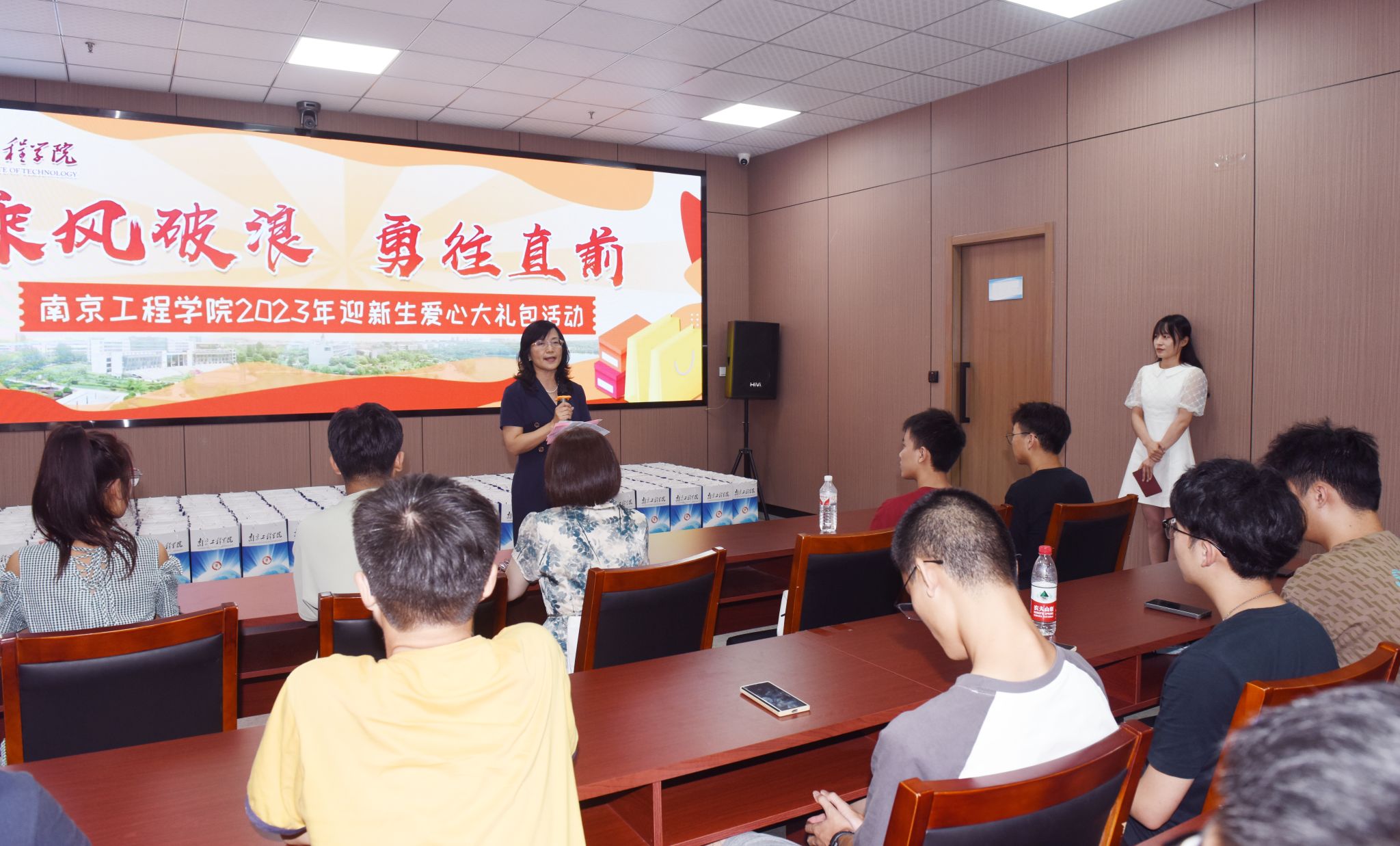 为确保每个新生都能入学无忧,学校在迎新现场设立“绿色通道”接待处,还为家庭经济困难新生准备了“爱心大礼包”,内有毛巾、雨伞、保温杯、U盘等生活学习用品套餐。9日下午,汪群副校长来到活动现场将爱心大礼包发给他们,勉励他们在学校的全力守护下乘风破浪、扬帆远航。