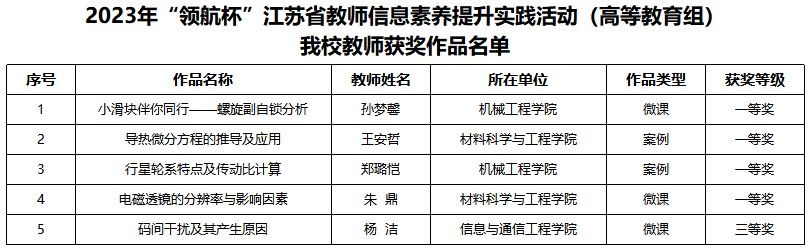 近日,由江苏省教育厅举办的2023年“领航杯”江苏省教师信息素养提升实践活动落下帷幕,beat365推荐参赛的高等教育组5项参赛作品全部获奖,其中一等奖4项,三等奖1项。