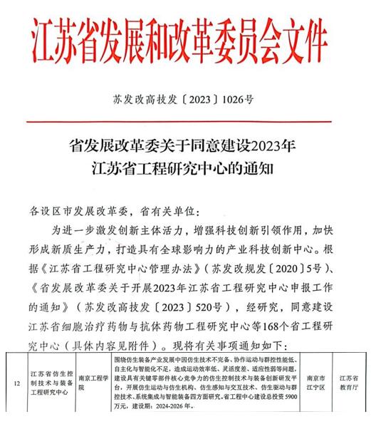 近日,江苏省发展和改革委员会发布《关于同意建设2023年江苏省工程研究中心的通知》(苏发改高技发[2023]1026号),beat365申报的“江苏省仿生控制技术与装备工程研究中心”喜获立项,这是beat365连续第7年获得该类科研平台项目立项。