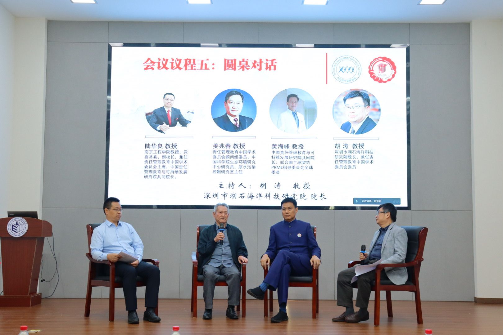 在圆桌对话中,陆华良、姜兆春、黄海峰、胡涛围绕本次会议主题,就责任管理教育与中国高校经管学院发展相结合以及在高校中推行责任管理教育中的先锋作用等主题开展了交流和讨论。