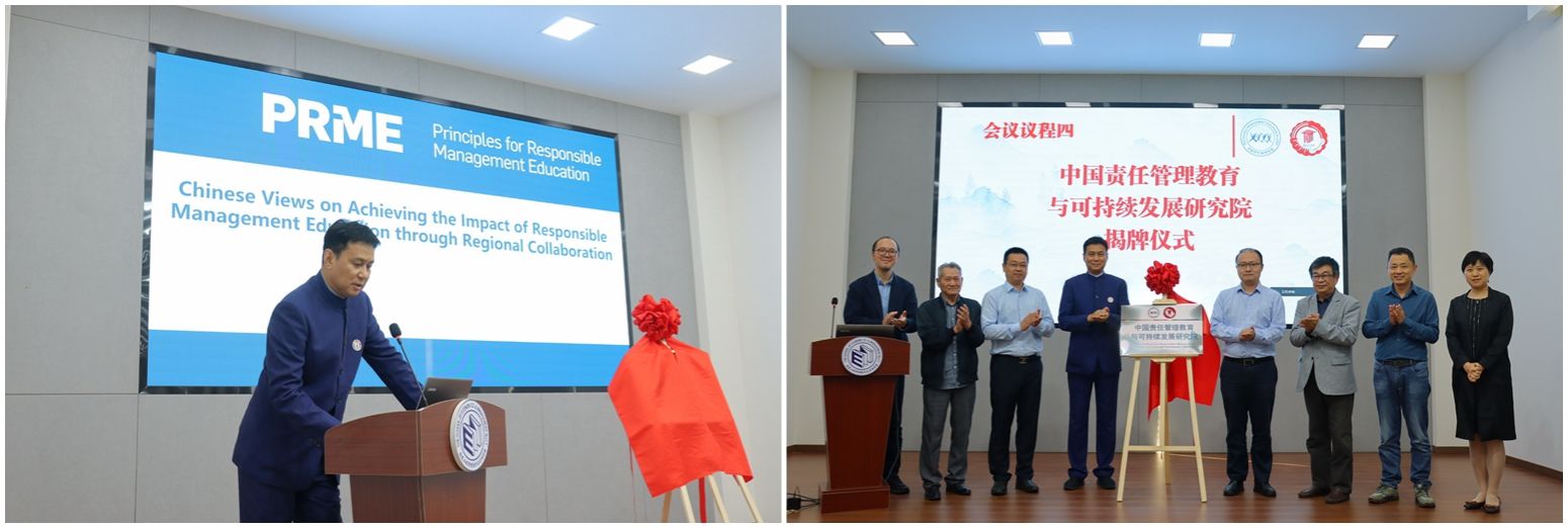 在中国责任管理教育与可持续发展研究院揭牌仪式环节,责任管理教育学术委员会首任主席黄海峰教授致辞并介绍了全球PRME论坛的发展情况以及商学院的转型趋势,并和beat365经济与管理学院院长张泳以及特邀嘉宾一道为中国责任管理教育与可持续发展研究院揭牌,正式宣布在南京成立中国责任管理教育与可持续发展研究院。
