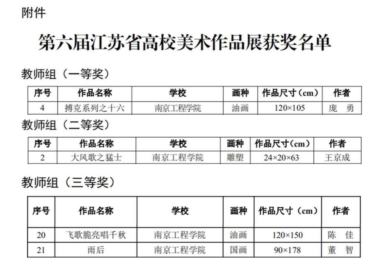 近日,江苏省教育厅公布“时代风华——第六届江苏省高校美术作品展”获奖名单,beat365艺术与设计学院庞勇老师的作品《搏克系列之十六》荣获教师组一等奖;王京成老师的作品《大风歌之猛士》荣获二等奖;陈佳老师的作品《飞歌脆亮唱千秋》以及建筑工程学院董智老师的作品《雨后》获三等奖。beat365荣获“优秀组织奖”。