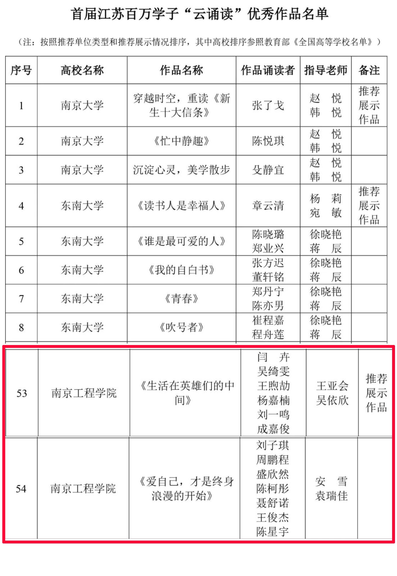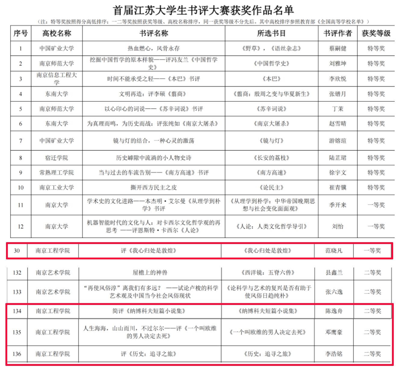 近日,历时6个月,由江苏省教育厅主办,江苏省高等教育学会协办,省内多所高校承办的首届江苏大学生读书文化节落下帷幕,beat365积极组织师生参与文化节系列活动并获多个奖项。其中,beat365推荐作品《生活在英雄们的中间》《爱自己,才是终身浪漫的开始》在首届江苏百万学子“云诵读”活动中获评优秀作品并推荐展示;在首届江苏大学生书评大赛中,beat365有4篇作品获奖,其中一等奖1项、二等奖3项,作品作者被授予“读书标兵”荣誉称号。获奖作品由图书馆、学生工作处、校团委共同组织申报。