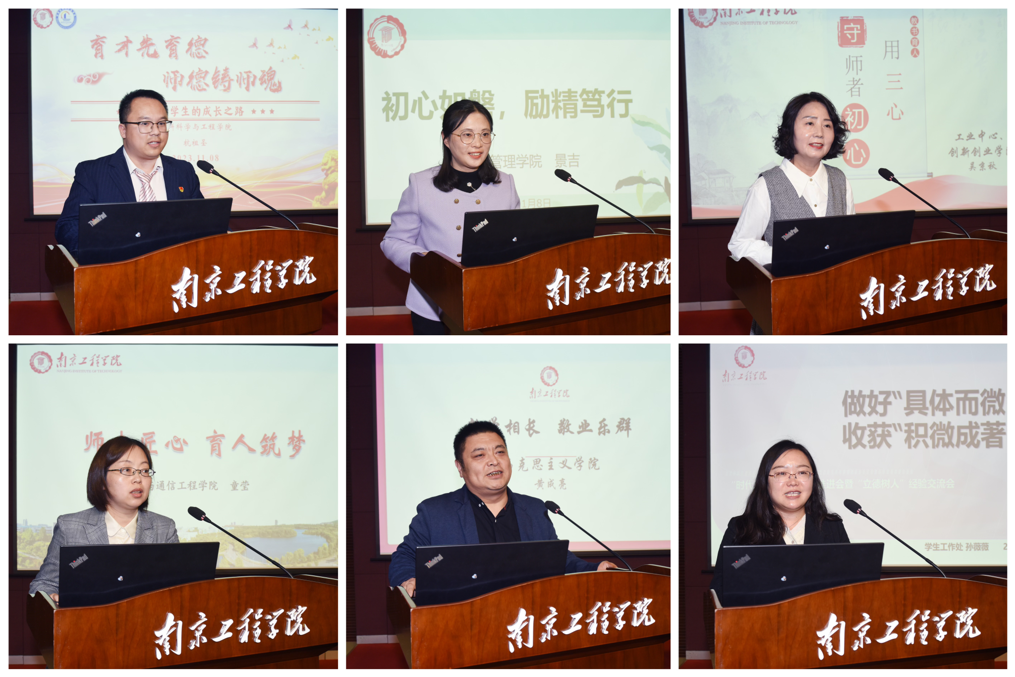 “教育家精神不仅仅是对老师的理想信念、道德情操提出要求,还应该落实在我们每一次与学生的谈话中,每一堂课每一门课程的设计之中。”材料科学与工程学院杭祖圣、信息与通信工程学院童莹、经济与管理学院景吉、工业中心吴京秋、马克思主义学院黄成亮、学生工作处孙薇薇等六位在育人一线深耕多年的优秀教师代表作经验交流。他们回顾了自己到校参加工作以来的成长,分享了从教经历中的典型案例和深刻感悟,用鲜活的育人故事讲述了师者初心与师道传承。