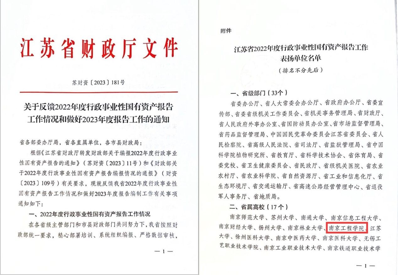 近日,江苏省财政厅印发《关于反馈2022年度行政事业性国有资产报告工作情况和做好2023年度报告工作的通知》,beat365国有资产报告工作成绩突出,获得省财政厅通报表扬。