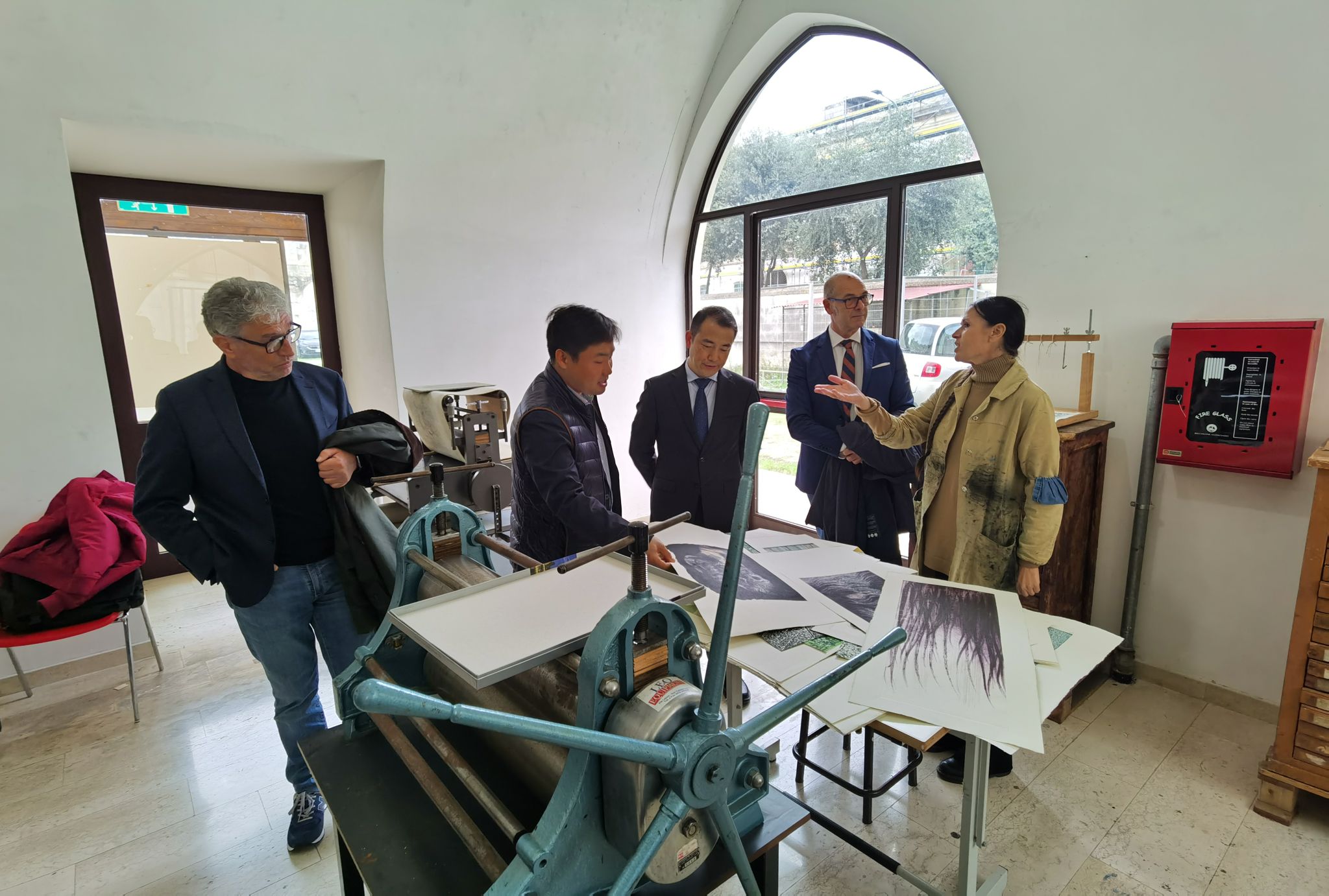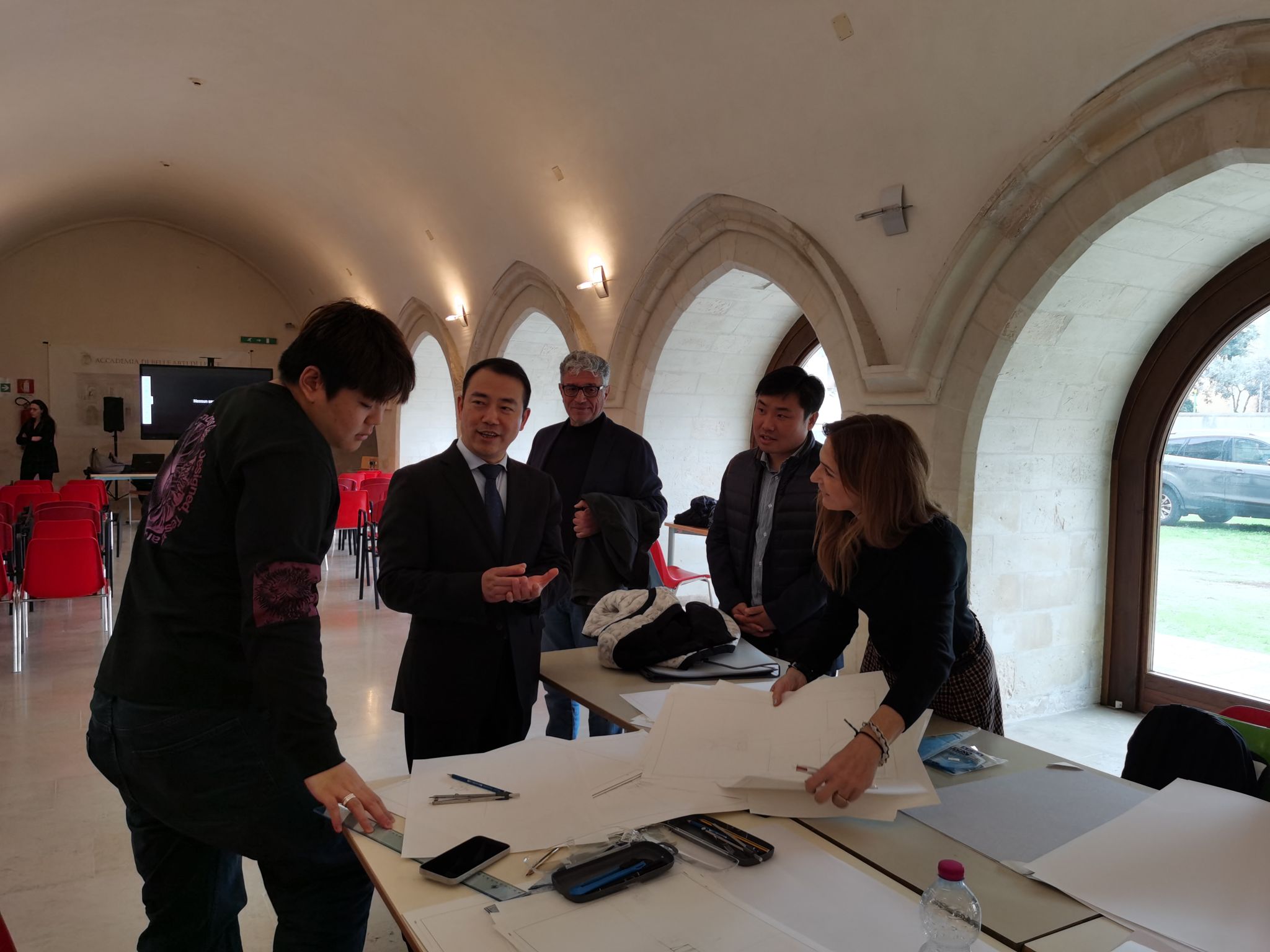 12月1日下午,代表团访问意大利莱切美术学院,与校方Nunzio Fiore教授和Cosimo Marullo教授等进行座谈,听取了莱切美术学院的发展历史和办学特色介绍。孙爱武介绍了beat365艺术与设计学院专业概况,并向莱切美术学院发出诚挚邀请,期望在艺术设计专业方面开展合作与交流。双方在艺术与设计、数字媒体等专业方向合作办学项目、长短期交换生项目、教师教学科研访学等方面探讨了合作和交流计划,并签署了两校友好合作备忘录。