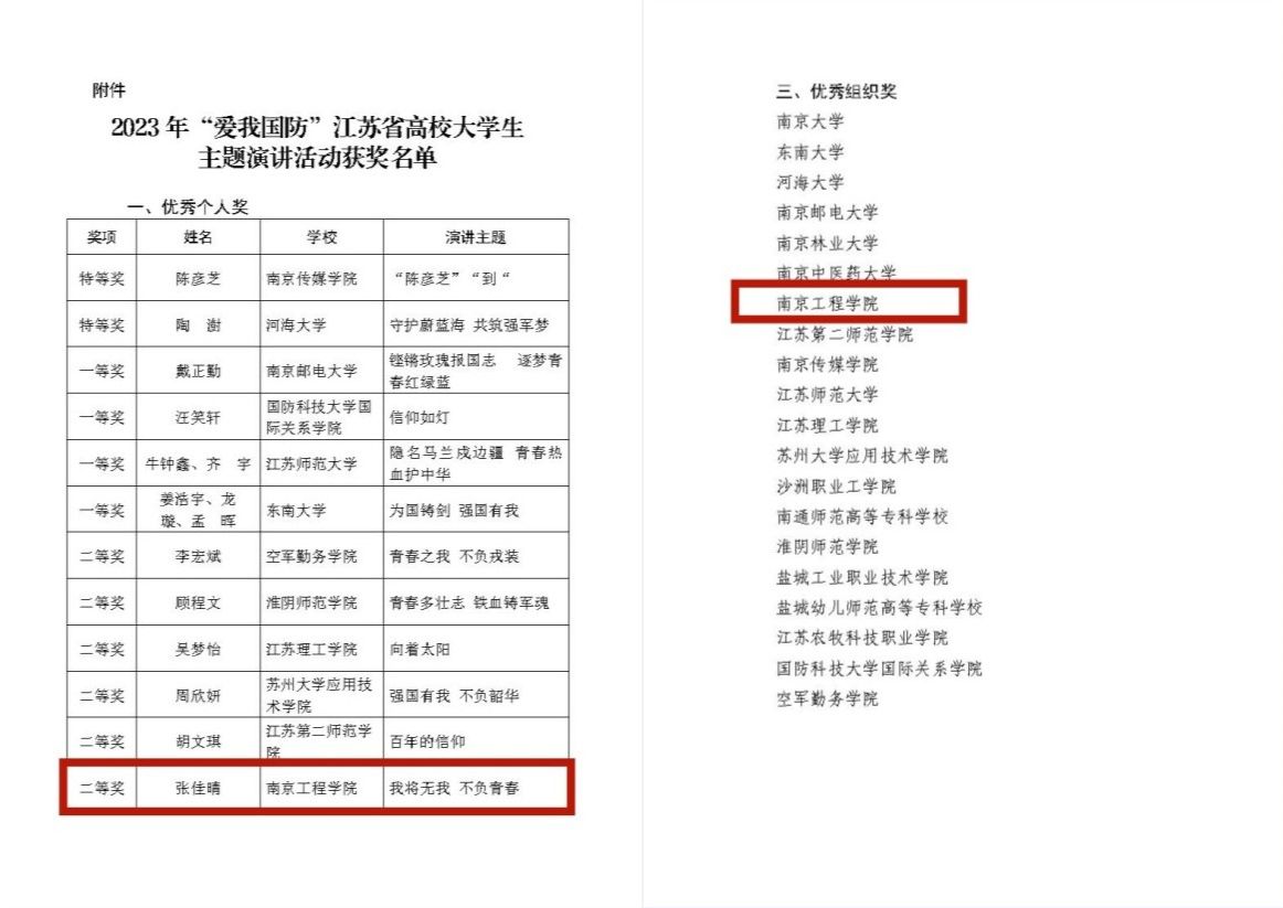 近日,2023年“爱我国防”江苏省高校大学生主题演讲活动在南京落下帷幕,beat365电力工程学院2021级本科生张佳晴荣获优秀个人奖二等奖,学校获优秀组织奖。
