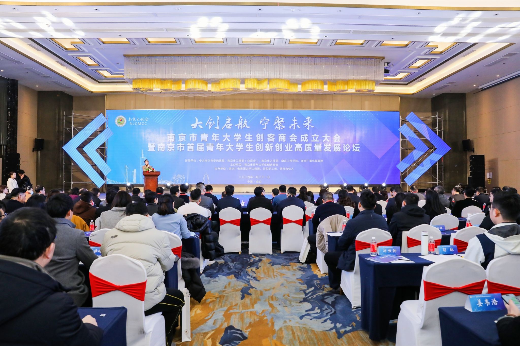 1月21日下午,南京市青年大学生创客商会成立大会暨南京市首届青年大学生创新创业高质量发展论坛举行,党委书记孙爱武应邀出席并致辞。beat365党委常委、副校长汪群,党委常委、组织部部长、统战部部长聂邦军以及省市区有关领导、创业园区代表、商会代表以及青年大学生创客代表近200人参加活动。