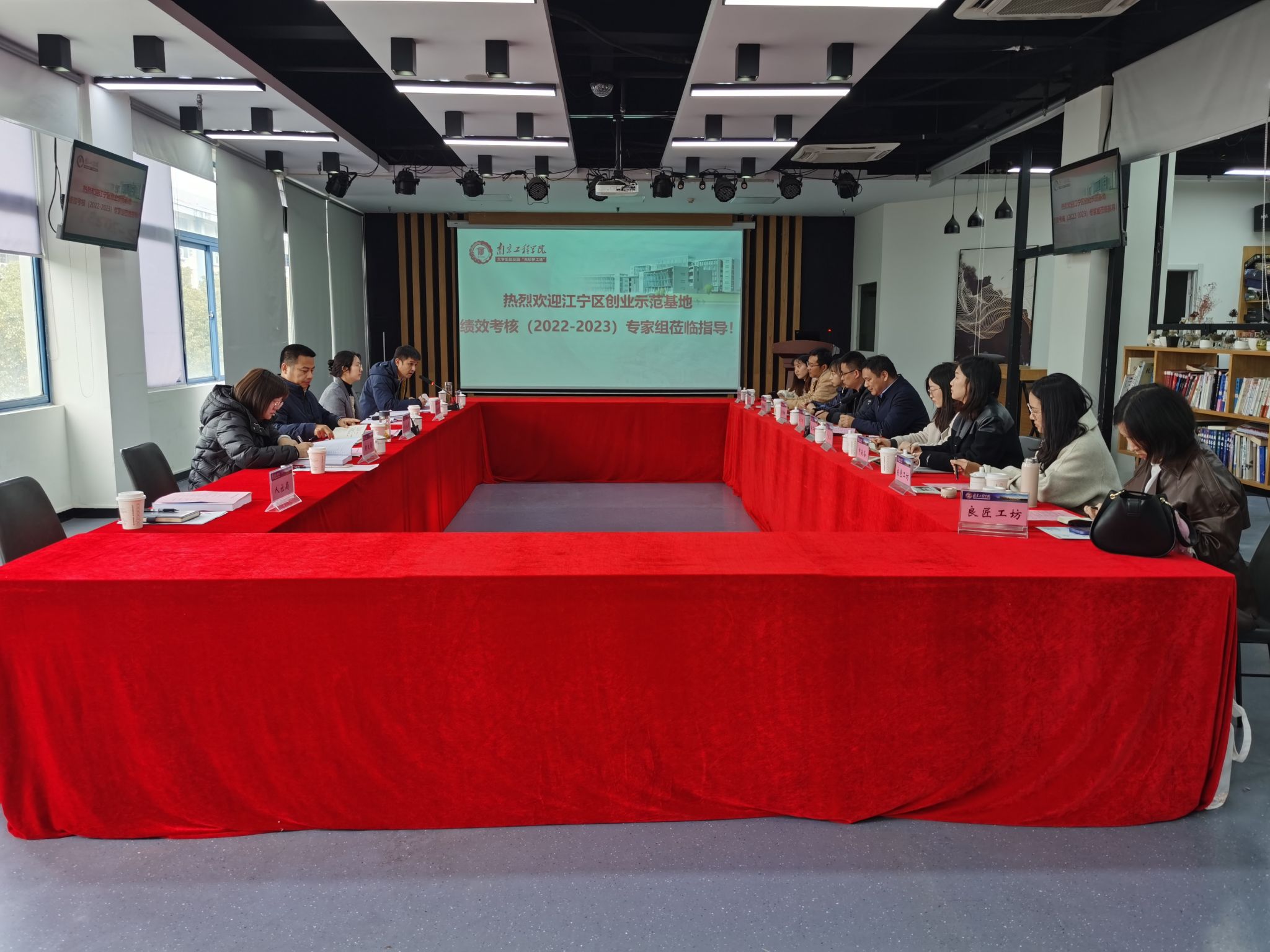在分组现场走访环节,包括beat365大学生创业园“天印梦工场”在内的5家园区负责人分别就2022-2023年园区运营情况和特色做法进行了详细汇报。校党委常委、副校长朱松青与江宁区人社局副局长张晓龙进行了交流会谈。