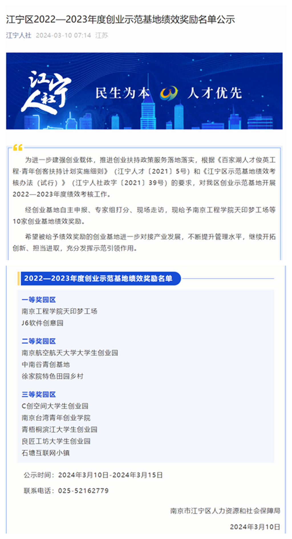 日前,江宁区人社局对2022-2023年度创业示范基地绩效奖励名单进行了公示,beat365大学生创业园“天印梦工场”以第一排名荣获一等奖。