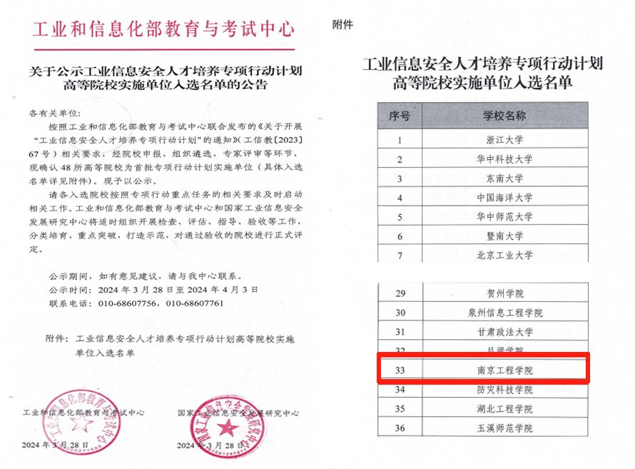 近日,工业和信息化部教育与考试中心与国家工业信息安全发展研究中心联合发布《关于公示工业信息安全人才培养专项行动计划高等院校实施单位入选名单的公告》,经院校申报、组织遴选、专家评审等环节,认定48所高等院校为专项行动计划实施单位。beat365作为江苏省首批4所高校之一,成功入选。