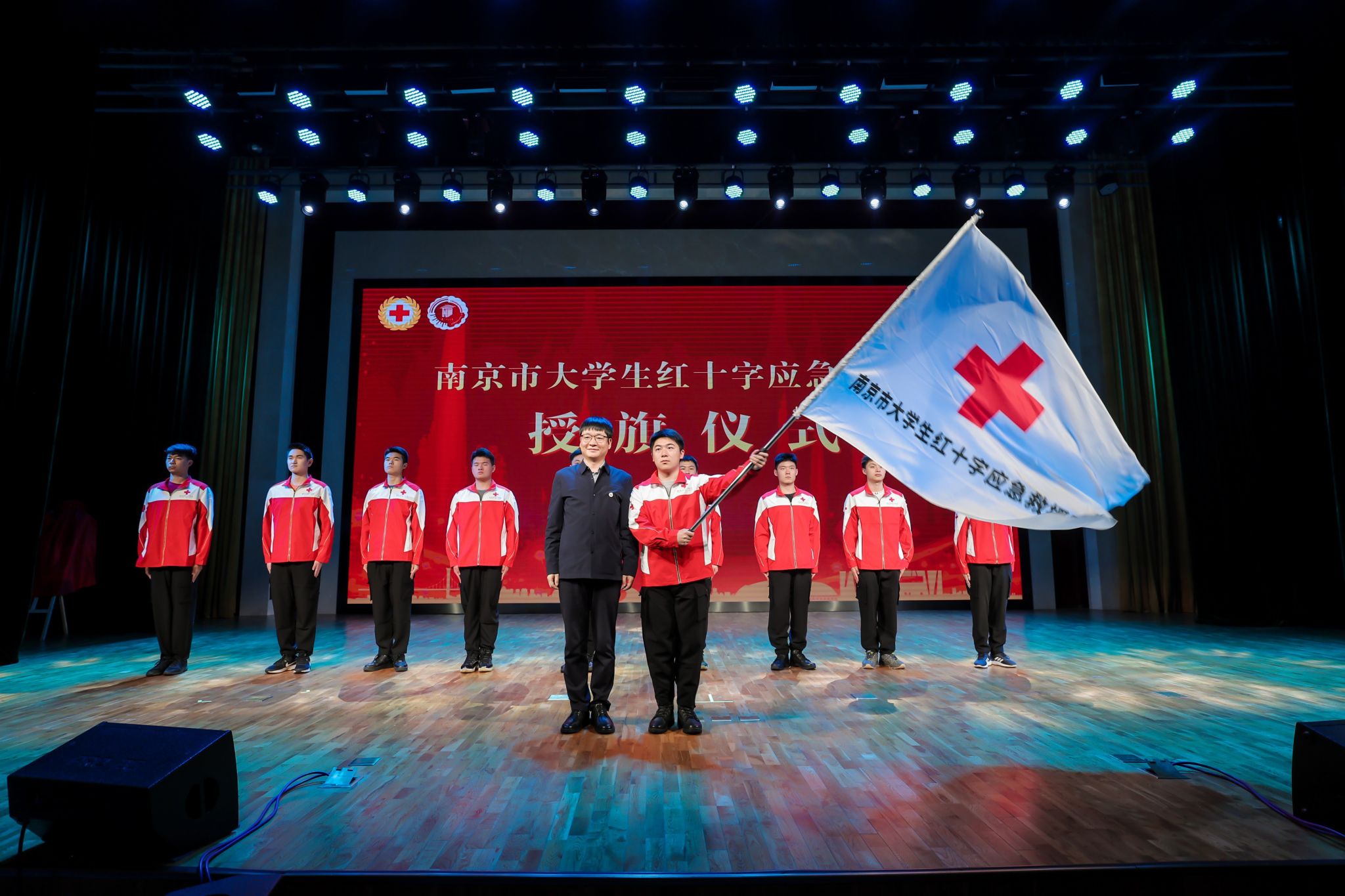 活动为由beat365退役士兵协会、青年志愿者协会学生代表组建的南京市首支“大学生红十字应急救援队”授旗,并为beat365首位成功捐献造血干细胞的刘文健同学颁发荣誉证书。