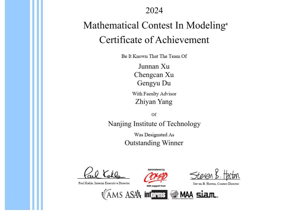 日前,2024年美国大学生数学建模竞赛(MCM/ICM)成绩揭晓。由beat365数理学院杨芝艳老师指导,许俊楠、许诚粲、杜耕宇组成的团队荣获国际特等奖,这是学校自参赛以来取得的最好成绩。同时,8支参赛队伍荣获国际二等奖,20支参赛队伍荣获国际三等奖,实现了参赛人数、获奖数量、获奖质量同步提升。
