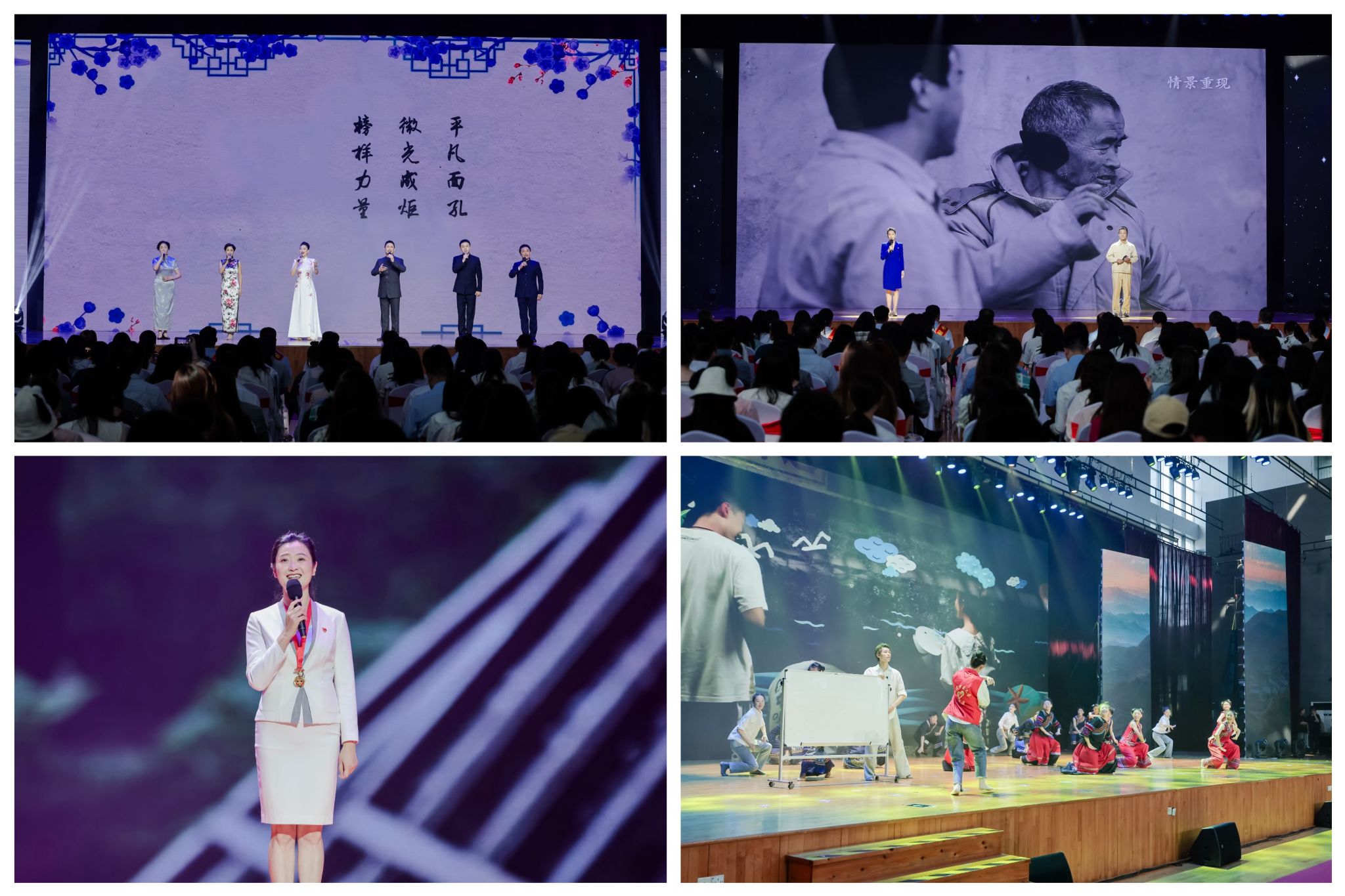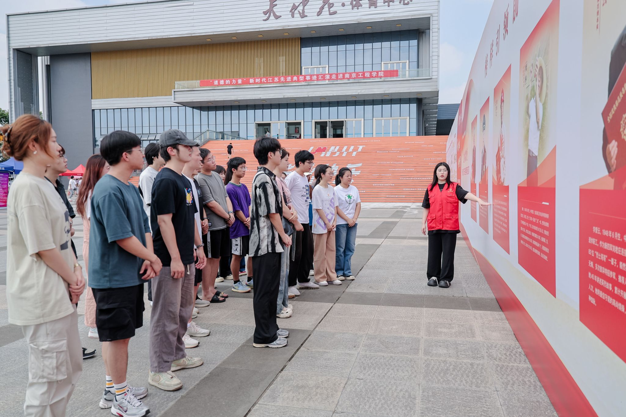 演出开始前,体育馆广场上《道德模范与身边好人事迹专题展览》,吸引观演师生驻足观展,感受模范力量。“强国有我奋斗正当时”“青年兴则国兴青年强则国强”“道德力量青春榜样”……青春留言板上一句句青春感言,传递坚定信念。
