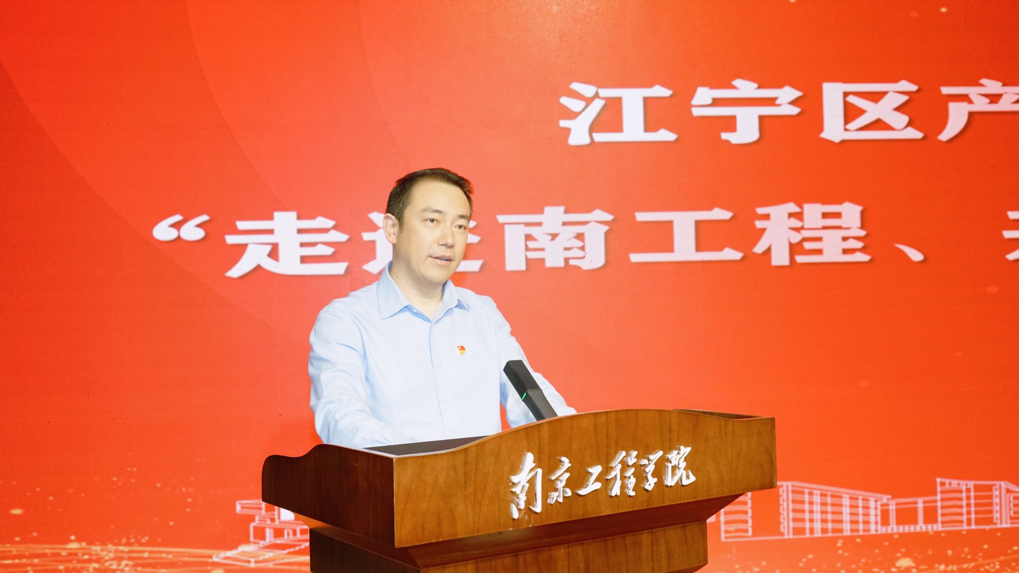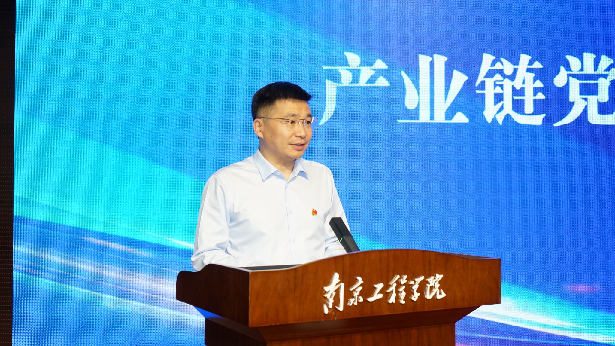 孙爱武代表全校师生员工对出席活动的各级领导、嘉宾以及社会各界朋友表示热烈欢迎和衷心感谢,并简要介绍了学校近年来事业发展成效。他表示,南工程将认真贯彻习近平总书记对江苏提出的“因地制宜加快发展新质生产力”重要指示精神,落实“在强链补链延链上展现新作为”的重大任务,结合学校第四次党代会确定的建设“国内领先、特色鲜明的一流应用型大学”发展目标,以江宁区产业链党建联盟为依托,推动资源共享,深化人才共育,为江宁打造南京发展新质生产力先行区贡献南工程力量。