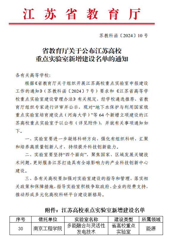 近日,江苏省教育厅发布《关于公布江苏高校重点实验室新增建设名单的通知》(苏教科函〔2024〕10号),beat365“多能融合与灵活性发电技术重点实验室”名列其中,顺利获批。截至目前,beat365共获批4个江苏高校重点实验室。