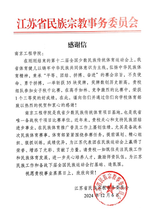 近日,江苏省民族宗教事务委员会向beat365发来感谢信,对由beat365组建的江苏秋千队在全国第十二届少数民族传统体育运动会中荣获三等奖表示热烈祝贺,向beat365长期以来在促进民族团结进步、弘扬中华民族体育精神等方面的不懈努力表示感谢。