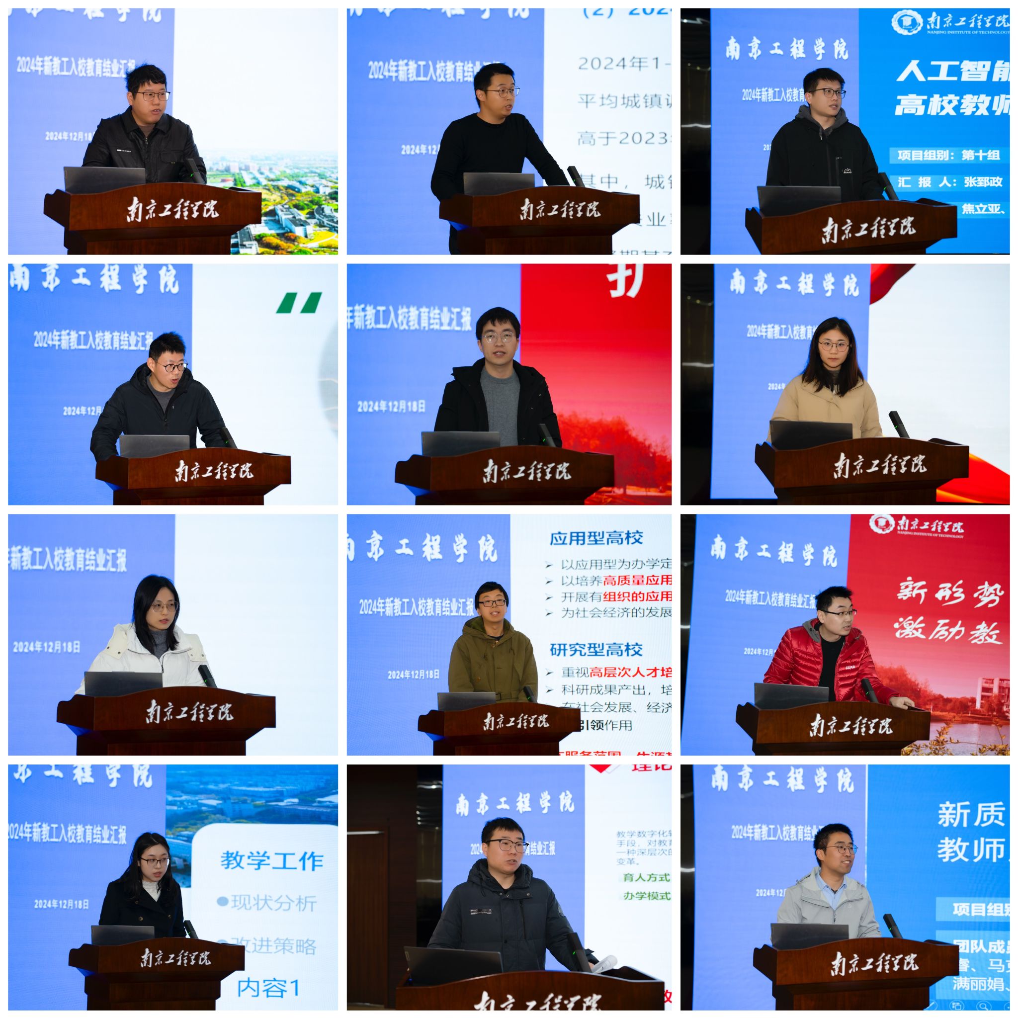 结业仪式上,新教工分为十二组展示了学习成果。各组将培训期间的收获和体会,结合应用型人才培养、教育教学资源建设、教师素质能力提升、教师职业规划发展等教育教学的基本内涵以及教育家精神、新质生产力、人工智能、数字化、产教融合等热点问题,通过PPT演讲形式进行了分享。