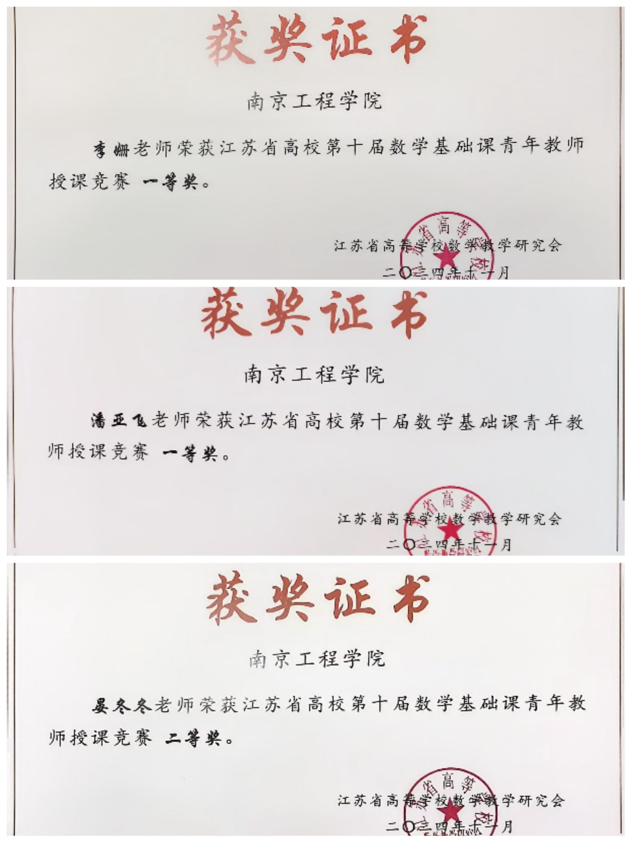 近日,2024年江苏省高等学校第十届数学基础课青年教师授课竞赛评奖结果揭晓。beat365数理学院教师表现出色,斩获一等奖2项、二等奖1项。其中,潘亚飞老师《数列极限的概念》和李姗老师《中心极限定理》荣获一等奖,晏冬冬老师《逆矩阵》荣获二等奖。