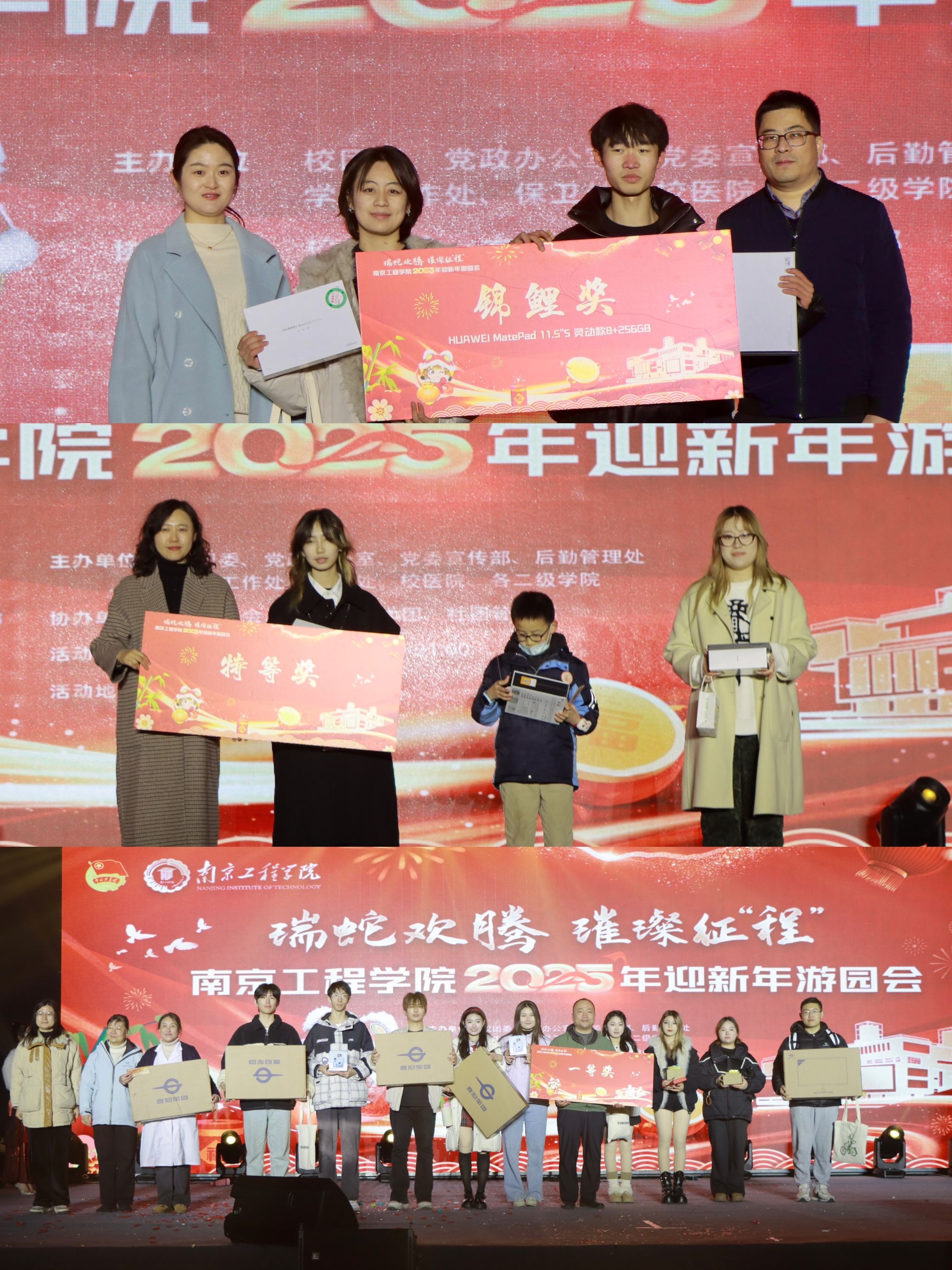 抽奖环节,相关职能部门领导、老师、校友在现场共抽取锦鲤奖、特、一、二、三等奖共计210份。奖品包括华为MatePad,索尼头戴耳机,拍立得套装,文创“南小程”玩偶等。每一位幸运儿的脸上都洋溢着幸福的笑容,激动地迎接了新年的第一份幸运。
