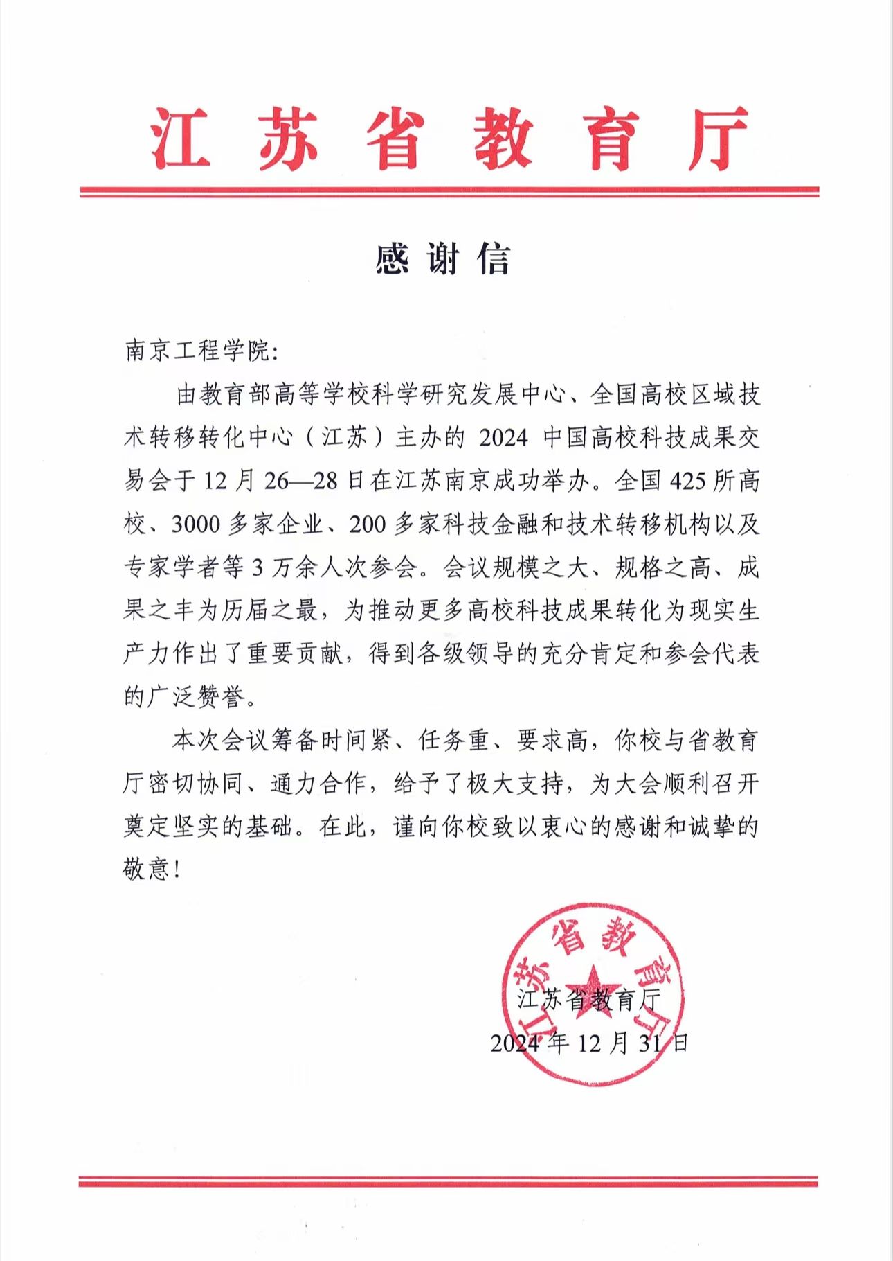 近日,beat365收到江苏省教育厅发来的感谢信,对学校在2024中国高校科技成果交易会筹备工作的贡献致以衷心的感谢和诚挚的敬意。