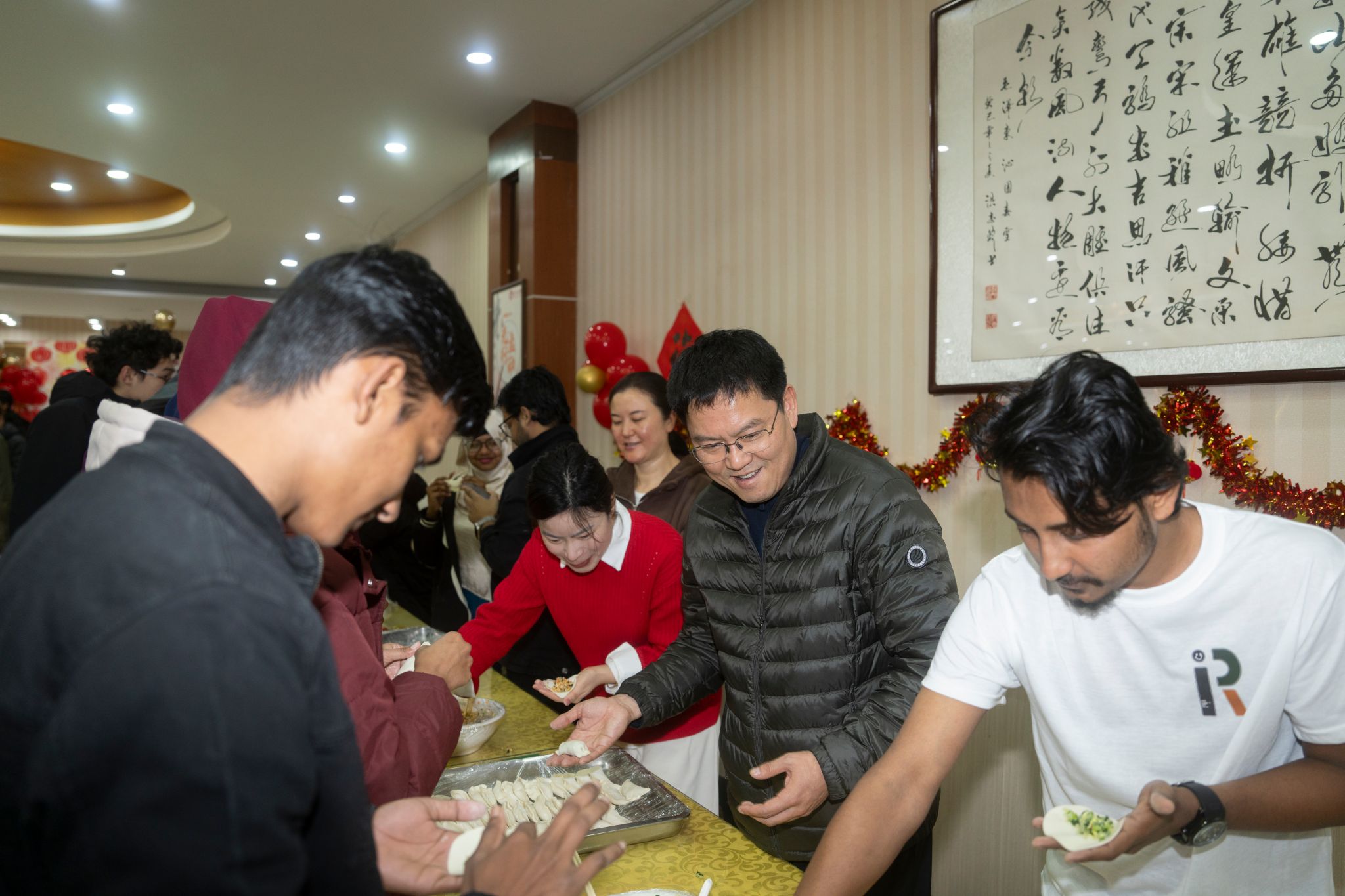党委副书记濮励杰来到留学生身边,与大家一边包水饺,一边亲切交流。他关切询问同学们寒假期间在校的学习生活情况,祝愿大家在新的一年学有所获,将来成为中外文化交流的桥梁和使者,并嘱咐大家给远在千里之外的家人们送上中国新年的祝福。