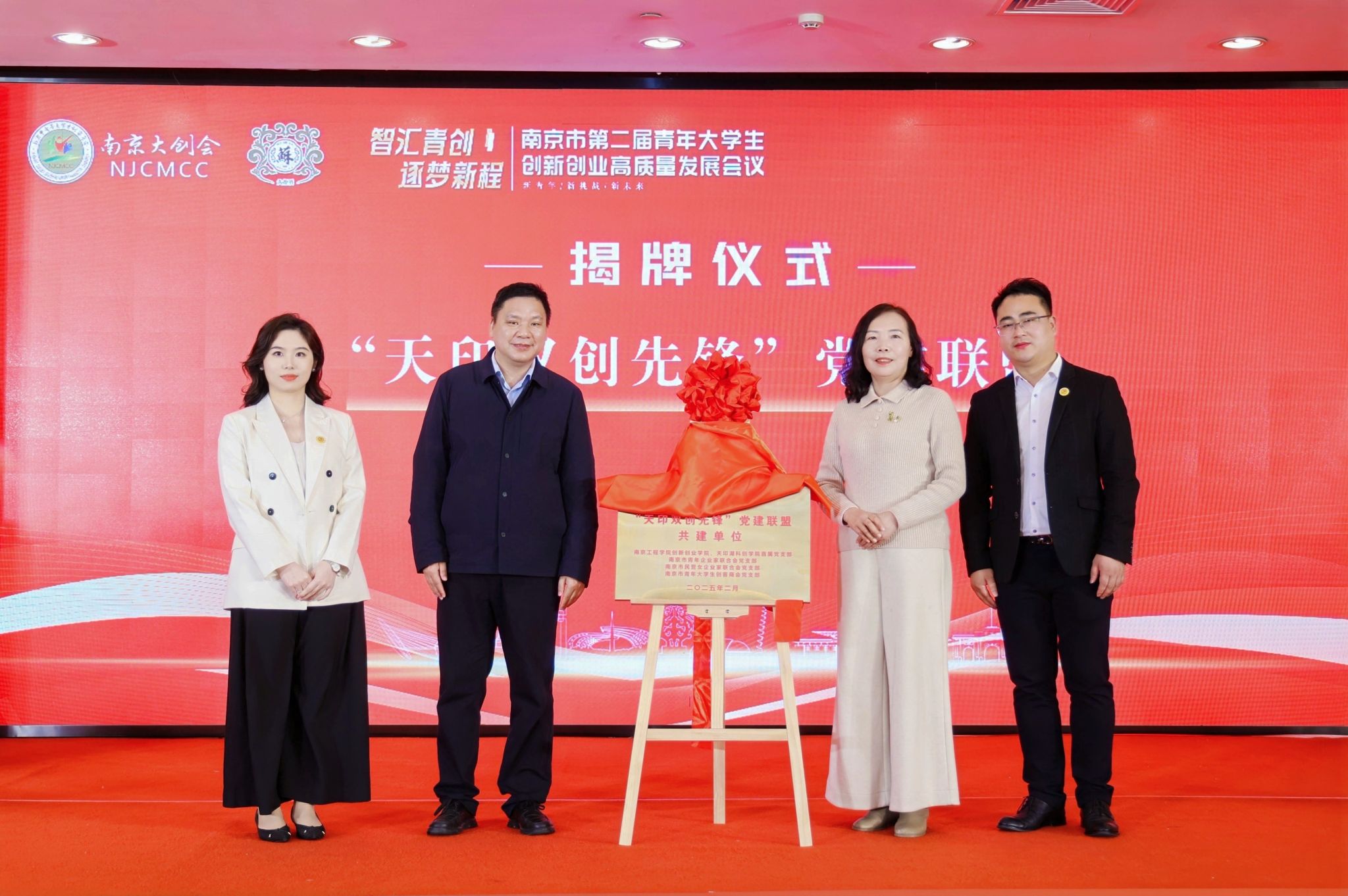 与会领导共同为南京市青年大学生创客商会新任执行会长、常务副会长、副会长授牌。会上,创新创业学院、天印湖科创学院直属党支部与南京市青年企业家联合会党支部、南京市民营女企业家联合会党支部及南京市青年大学生创客商会党支部签约成立党建共建联盟。