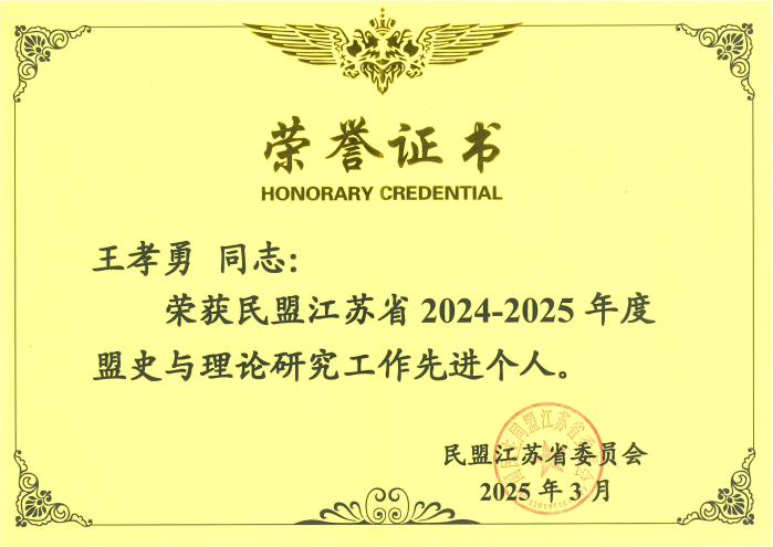 近日,民盟江苏省十三届十二次常委会议在南京召开。会议表彰了2024-2025年度先进单位和先进个人。民盟beat365官方网站委员会荣获民盟江苏省2024-2025年度活力基层组织建设先进基层组织,王孝勇荣获民盟江苏省2024-2025年度盟史与理论研究工作先进个人,刘一丹荣获民盟江苏省2024-2025年度组织工作先进个人。