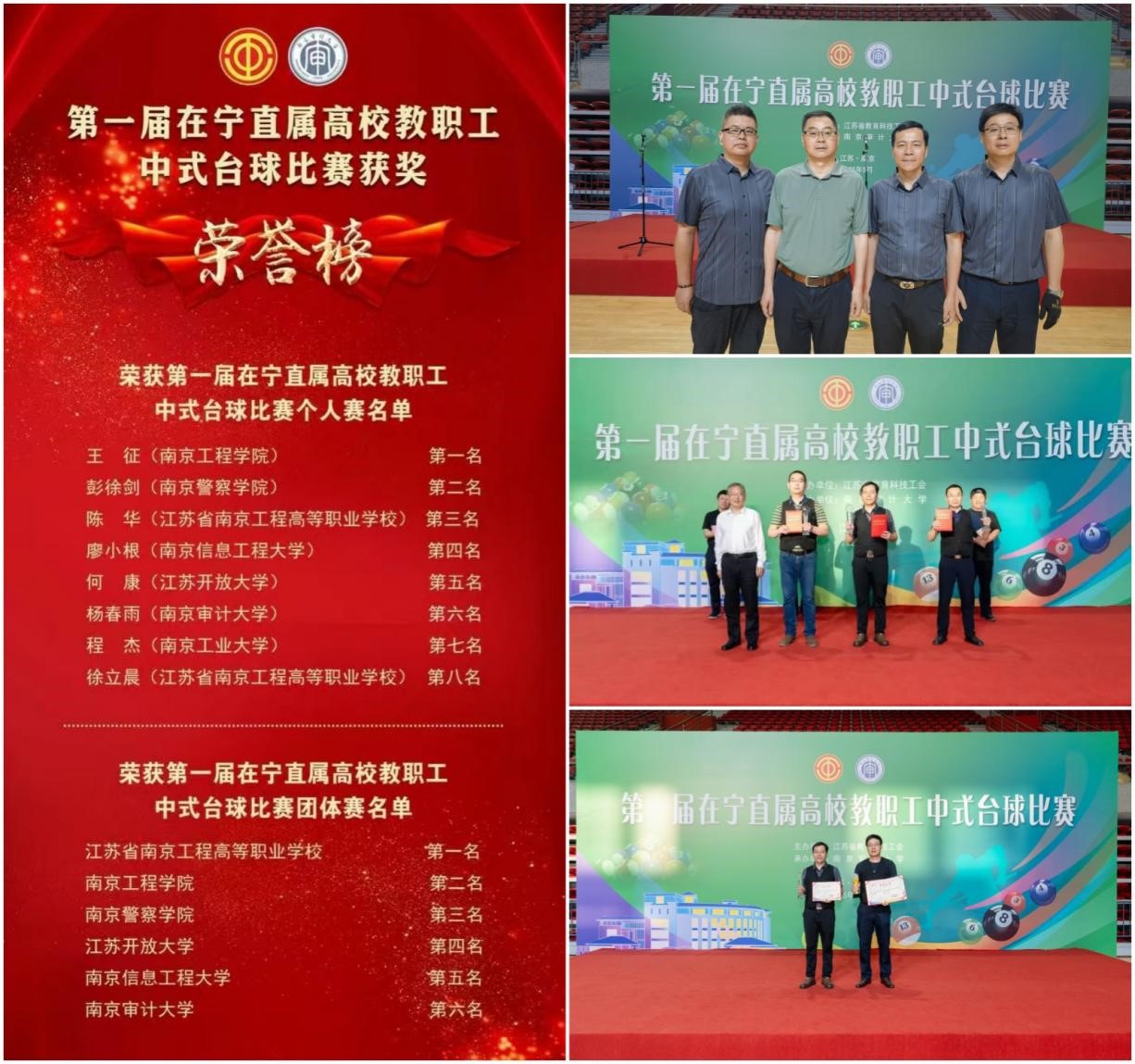 为庆祝中华全国总工会成立100周年,5月17-18日,第一届在宁直属高校教职工中式台球比赛在南京审计大学火热开赛。本次赛事由江苏省教科工会主办、南京审计大学承办,吸引了22所在宁直属高校、66名教职工选手同场竞技。经过两天激烈角逐,共完成71场比拼、近400局精彩对决,3万余人在线关注,大家以球会友,共同见证这场精彩的台球盛宴。