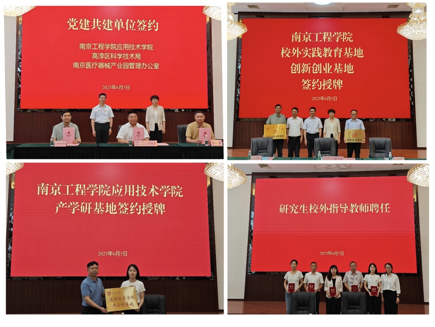 活动现场,高淳区医疗器械产业园管理办、科技局与工程训练中心、应用技术学院签署党建共建协议,并为“校外实践教育基地”“创新创业基地”等产学研平台签约授牌。工程训练中心、应用技术学院智能制造教工党支部、系统集成教工党支部等5个基层党支部分别与瑞杨医用、斯瑞奇医疗等企业党支部结对共建。应用技术学院产学研基地同时挂牌,一批企业技术骨干受聘为beat365研究生校外指导教师。