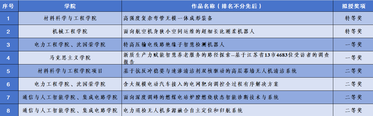 本次省赛,材料科学与工程学院项目《高强度复杂弯管无模一体成形装备》、机械工程学院项目《面向航空机身狭小空间运维的超细长比刚柔机器人》获得省赛特等奖,电力工程学院、沈国荣学院项目《特高压输电线路绝缘子智慧检测机器人》、马克思主义学院项目《新质生产力赋能智慧养老服务的路径探索--基于江苏省13市4683位受访者的调查报告》获得省赛一等奖,材料科学与工程学院项目《基于抗反冲稳姿与速渗清洁剂双核驱动的高层幕墙无人机清洁系统》、电力工程学院、沈国荣学院项目《含大规模电动汽车接入的电网靶向调控全过程有序解决方案》、通信与人工智能学院、集成电路学院项目《面向深度调峰的燃煤电站炉膛燃烧状态智能诊断技术与系统》、通信与人工智能学院、集成电路学院项目《电力巡检无人机多源融合自主定位和归航系统》获得省赛二等奖。备赛期间,项目团队师生全心投入、精心打磨作品,共同为成绩的取得奠定了良好基础。终审答辩中,队员以专业陈述、从容姿态和过硬素养获得了专家评委的一致好评,并最终取得佳绩。
