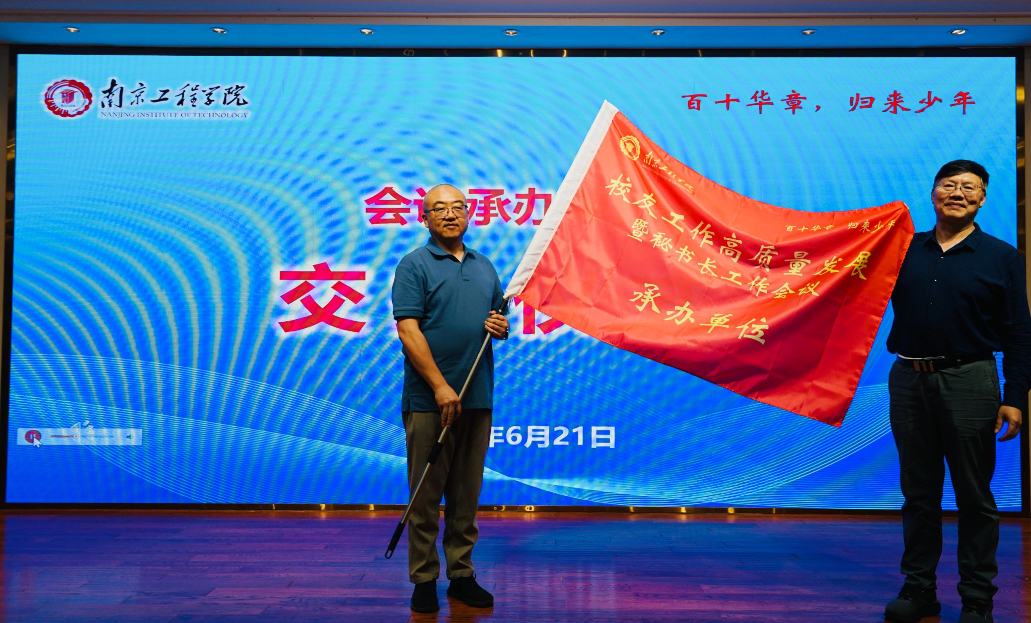 会议最后举行了第八届秘书长工作会议承办单位发布暨会旗交接仪式。承办单位南通校友联谊会秘书长顾旭峰校友表示,理事会全体成员将全力以赴,提前谋划,精心组织,确保会议的顺利圆满召开。