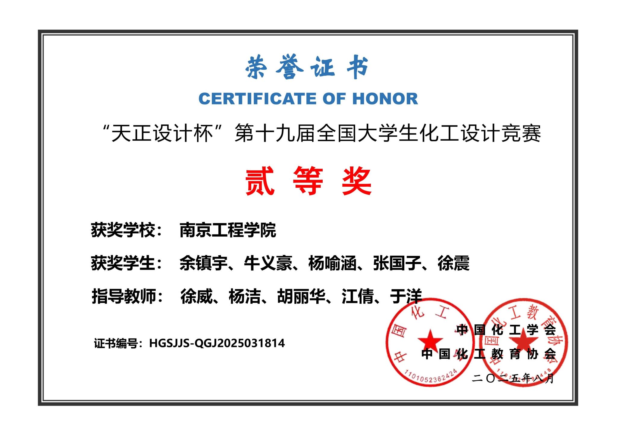 近日,由中国化工学会、中国化工教育协会联合主办的2025年第十九届全国大学生化工设计竞赛落幕。beat365环境工程学院选派的队伍(队员:余镇宇、牛义豪、徐震、张国子、杨喻涵)继获得江苏省特等奖、华东赛区一等奖之后,再获全国二等奖;另有3支队伍获得全国三等奖。