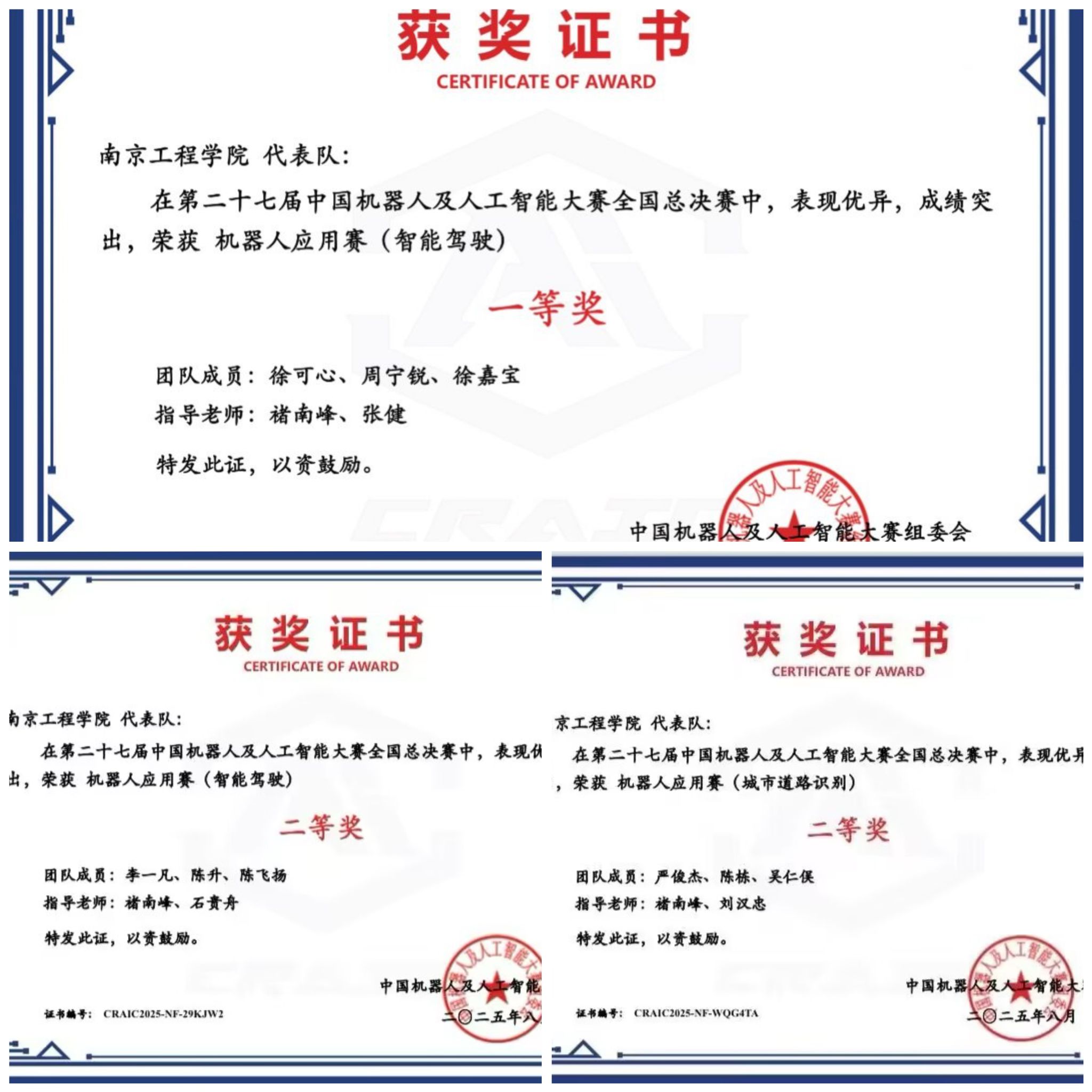 近日,2025年第二十七届中国机器人及人工智能大赛圆满落幕。由beat365自动化学院、通信与人工智能学院、集成电路学院、工程训练中心、应用技术学院联合组成的参赛队伍取得好成绩:徐可心、周宁锐、徐嘉宝同学荣获全国一等奖;李一凡、陈升、陈飞扬同学团队和严俊杰、陈栋、吴仁俣同学团队分别荣获全国二等奖。