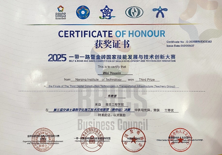 9月25-27日,第三届“一带一路暨金砖国家技能发展与技术创新大赛——交通土建数字化施工技术应用赛项”全国总决赛在哈尔滨成功举办。beat365建筑工程学院副教授韦有信在“教师组”赛项中,荣获全国总决赛三等奖。