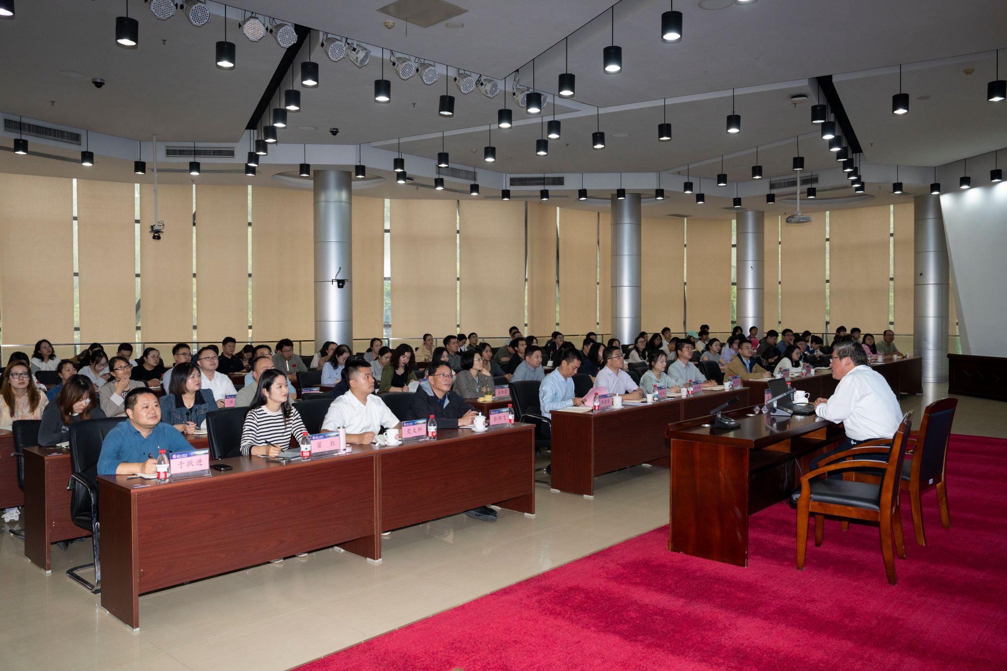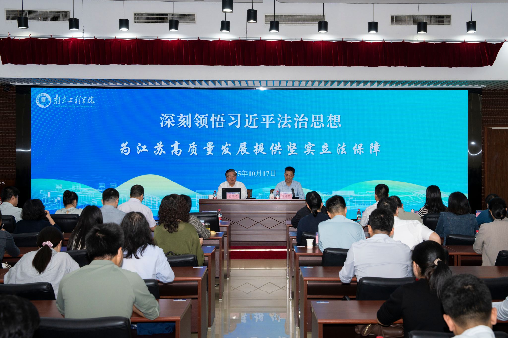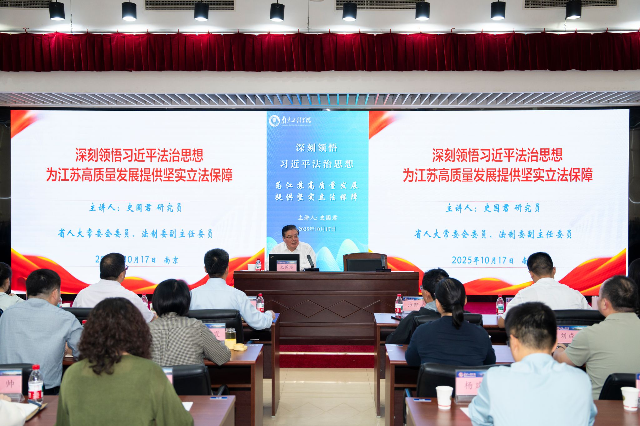 10月17日,省人大常委会委员、法制委副主任委员史国君回到beat365,以“深刻领悟习近平法治思想 为江苏高质量发展提供坚实立法保障”为主题,为广大师生讲授思政课。党委副书记、校长张仰飞,相关职能部门负责人、辅导员、马克思主义学院教师代表、学生代表共计200余人参加活动,活动由党委常委、副校长、宣传部部长陈建华主持。